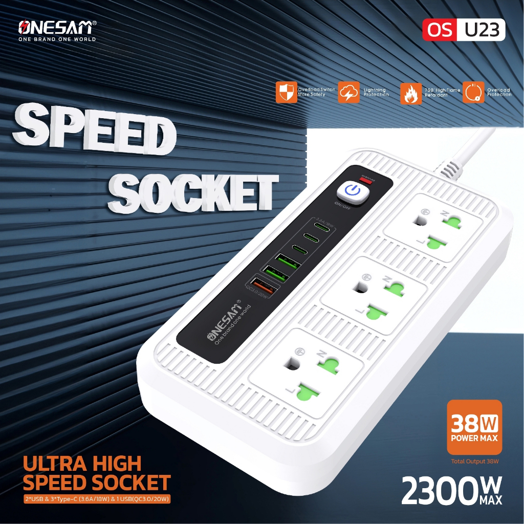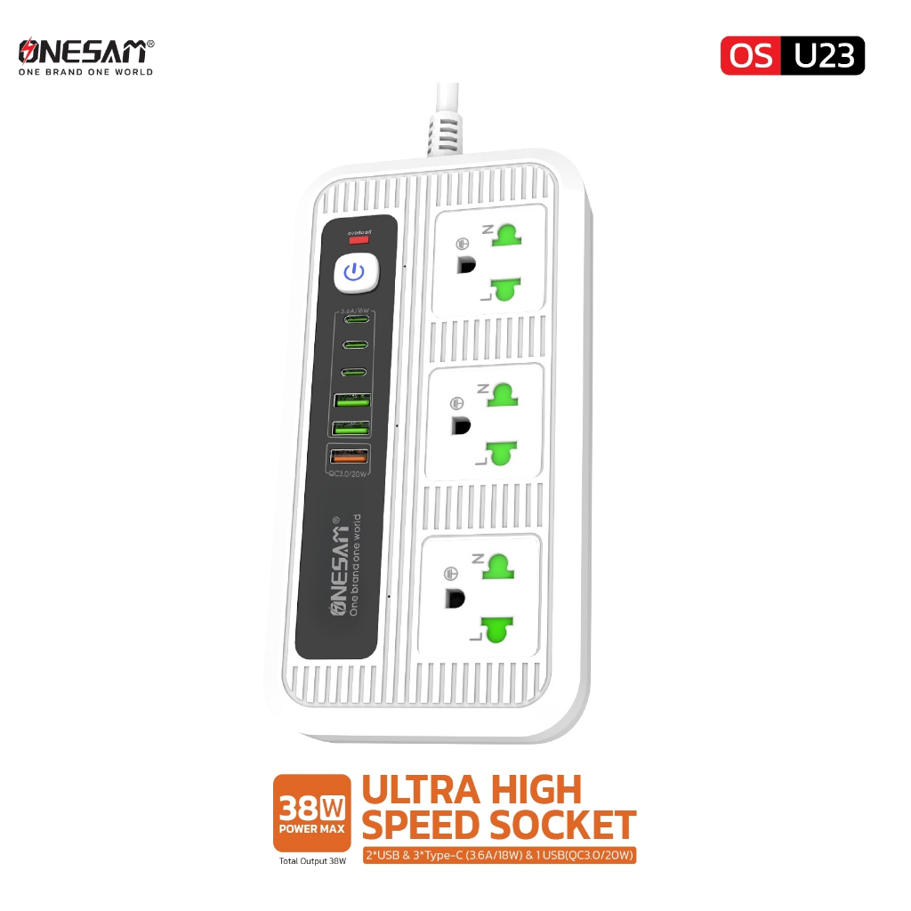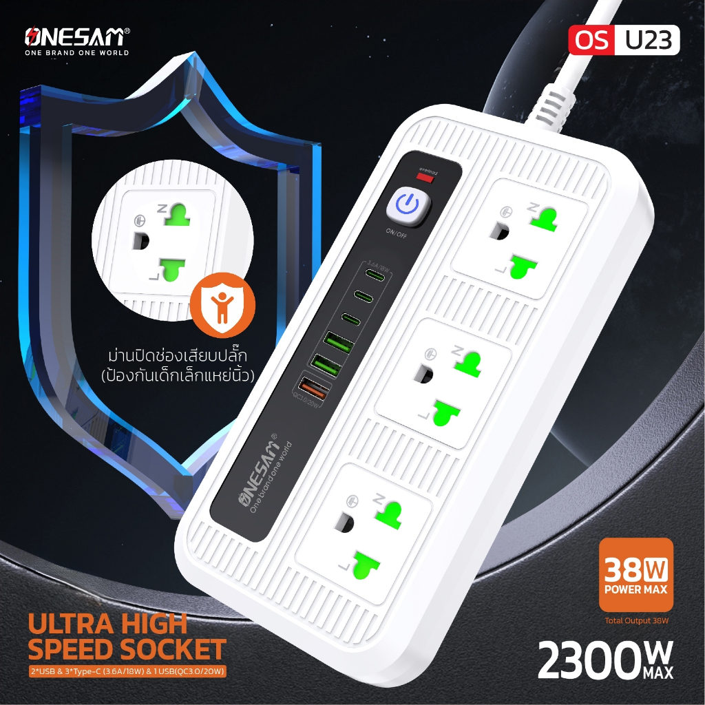 ปลั๊กไฟ ONESAM รุ่น OS-U23 USB 2พอร์ต USBชาร์จไว 1พอร์ต และ PD 3พอร์ต สายยาว 2,5 เมตร ของแท้ 100% รับประกัน 1 ปี