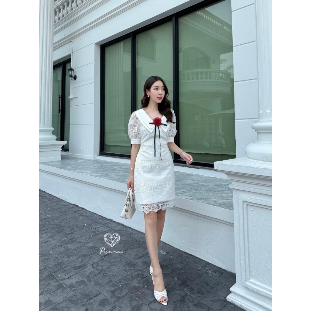 [PISAMAI] เดรสแขนตุ๊กตาสีขาวตัวสั้นงานฉลุลูกสั้นแต่งคอปกซ้อน2ชั้น มาพร้อมกับเข็มกลัดดอกกุหลาบเข้าเซ็ต