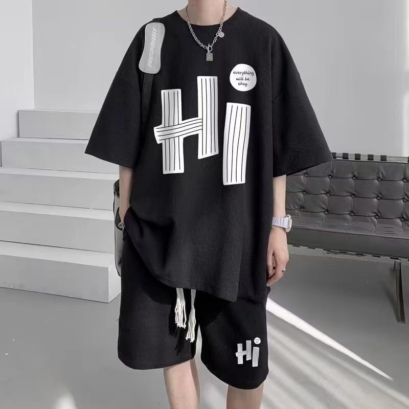 พร้อมส่ง ไซส์ ใหญ่ชุดสูทผู้ชาย (เสื้อยืดคอกลม+กางเกงขาสั้น) พิมพ์ลาย ขนาดมาตรฐาน