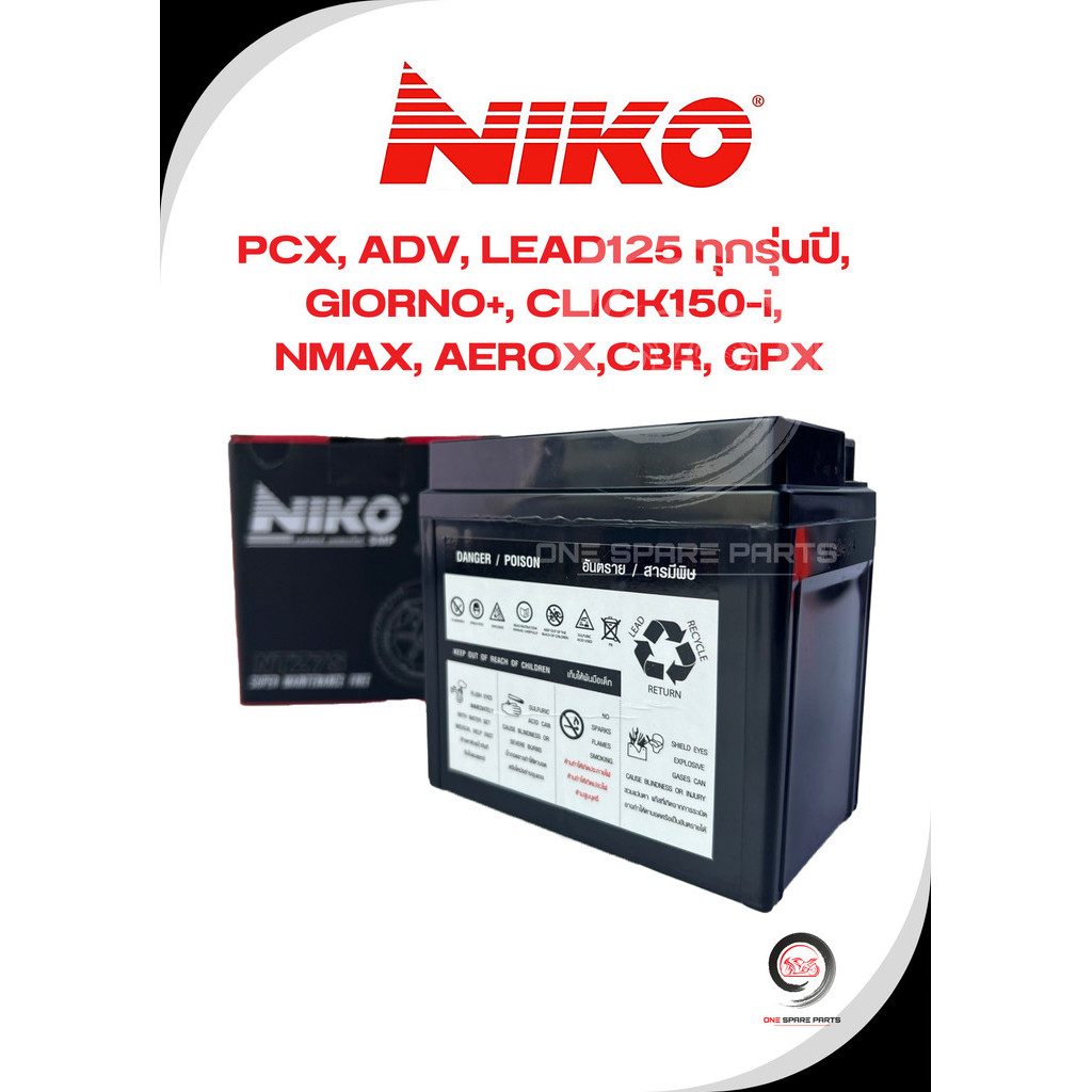 แบตเตอรี่ รถมอเตอร์ไซด์ NIKO 7 แอมป์ PCX, ADV, GIORNO+, LEAD, CLICK150-i, NMAX, AEROX,CBR, GPX / 12 Volt / NTZ7S