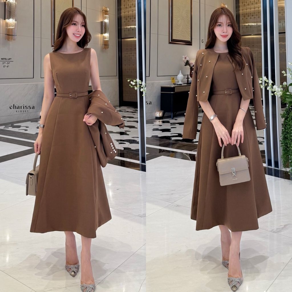 Charissa ● พร้อมส่งสีดำ น้ำตาล แดง ชมพู/ชุดเซ็ต3ชิ้นเดรส+ครอป+เข็มขัด