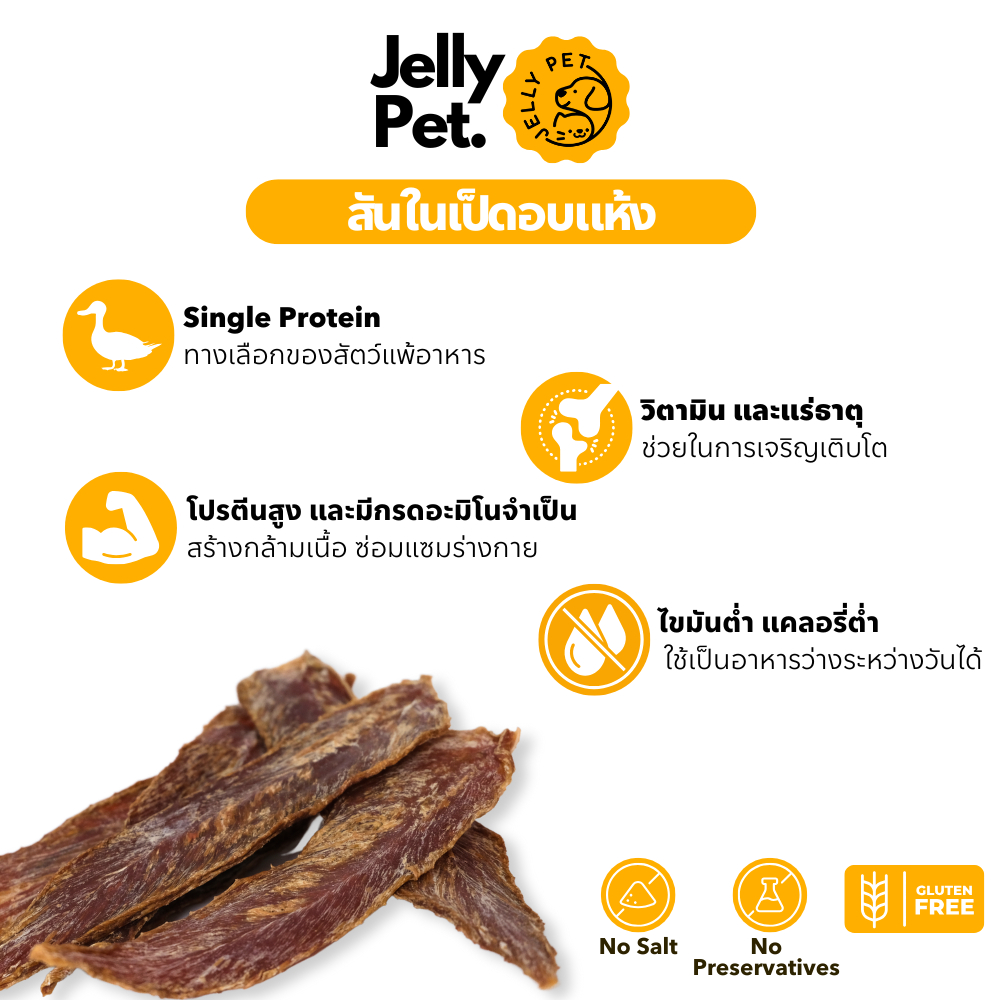 Jelly Pet Duck Jerky สันในเป็ดอบแห้ง 50กรัม เป็ดอบแห้ง ไม่เค็ม ไม่ปรุง ขนมสุนัขสุขภาพ ขนมแมวสุขภาพ