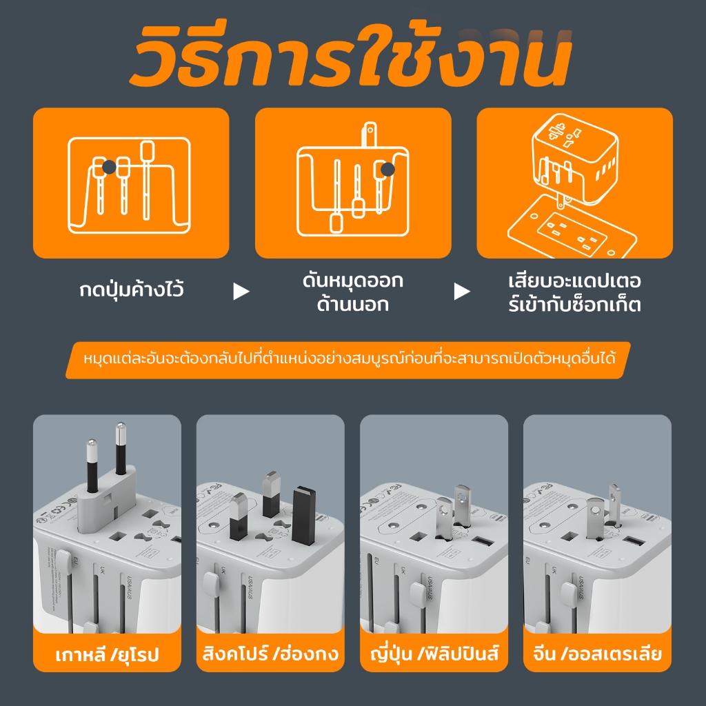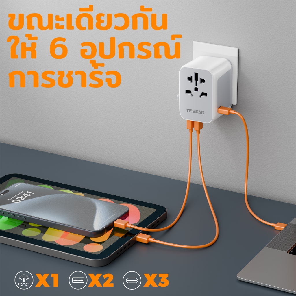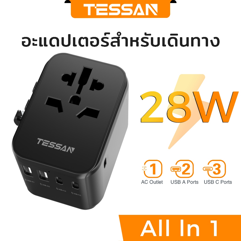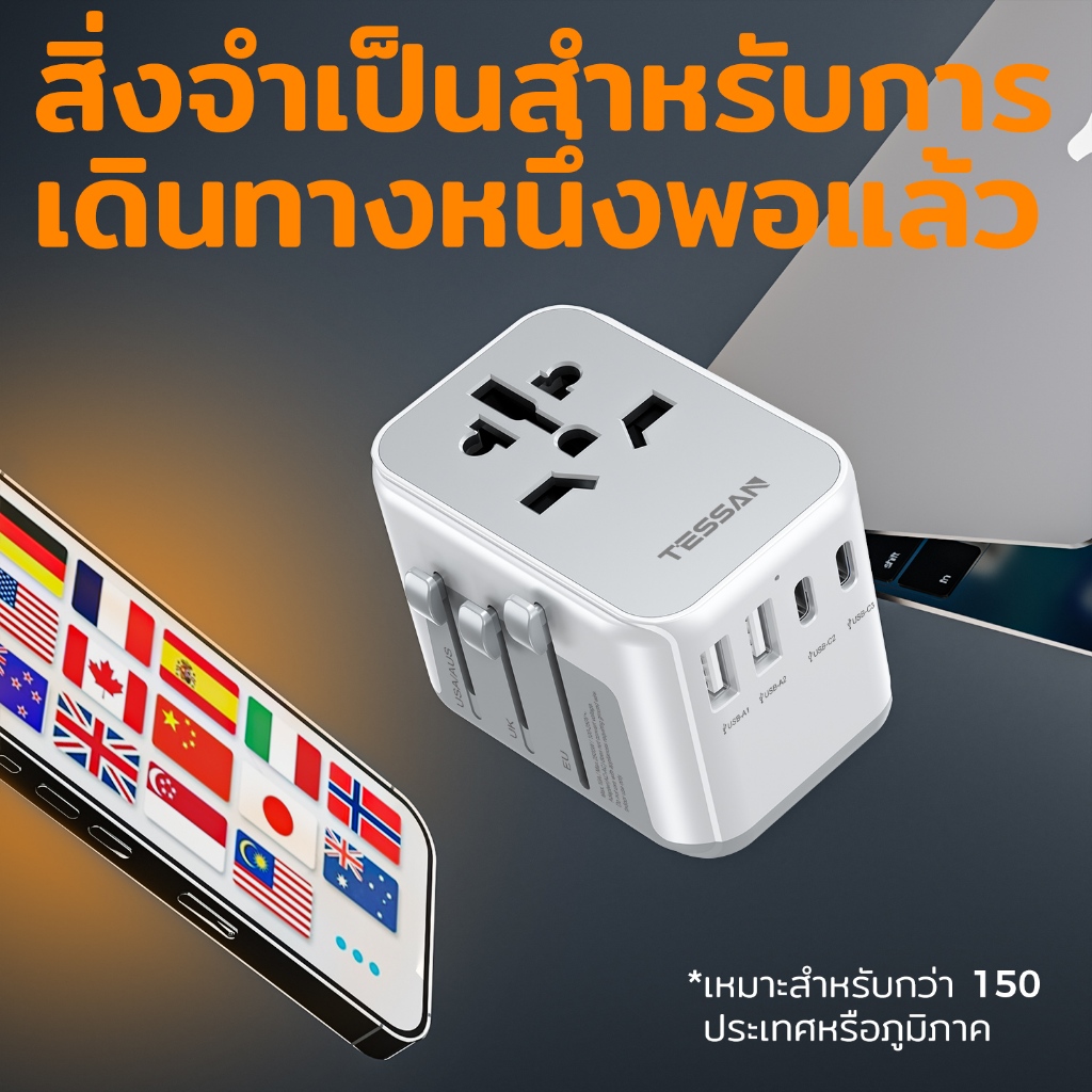TESSAN อะแดปเตอร์ปลั๊กสากล พร้อมที่ชาร์จ USB C 2 พอร์ต 2 พอร์ต สําหรับ TH เป็น EU UK AUS JP