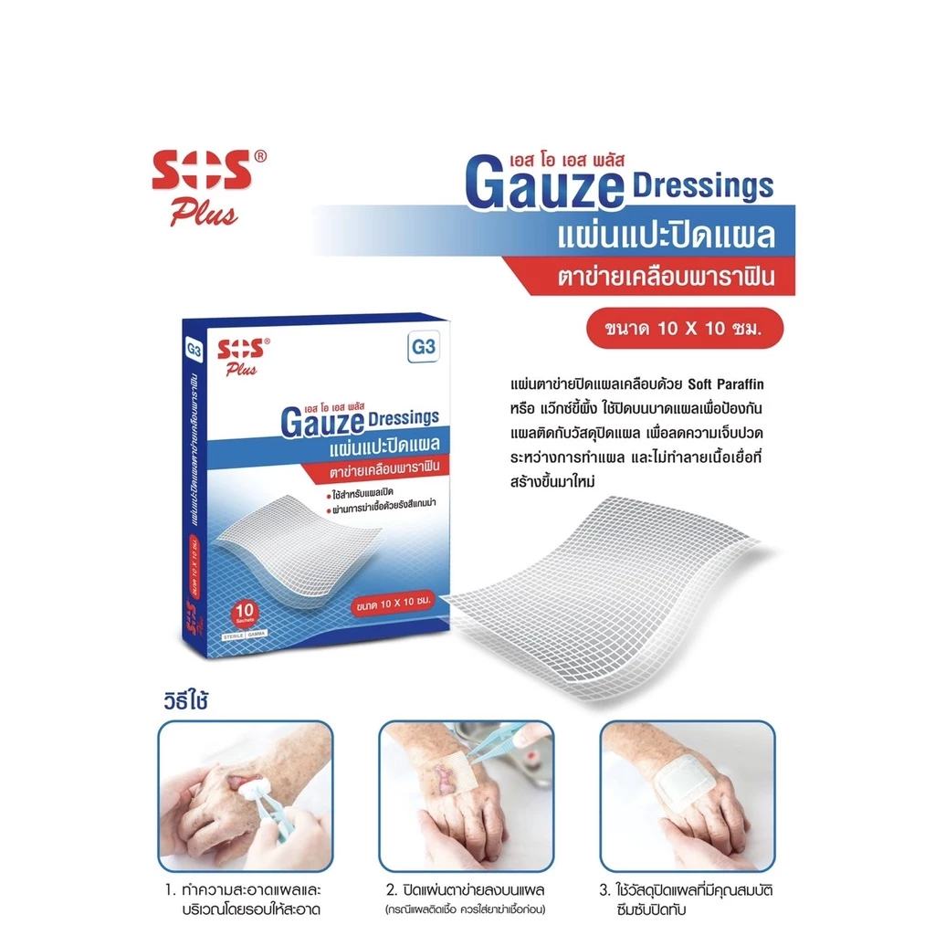 ( กล่อง 10 ชิ้น ) SOS Plus GAUZE / Bactigras แผ่นตาข่ายปิดแผลเคลือบ ขนาด 10x10 cm.