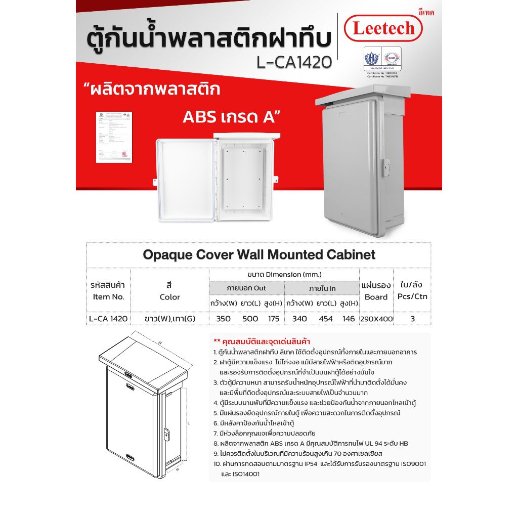 Leetech ตู้พลาสติกกันน้ำฝาทึบ มีหลังคา ขนาด 14x20 นิ้ว L-CA1420W สีขาว