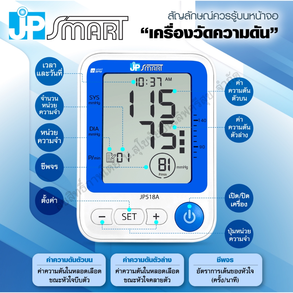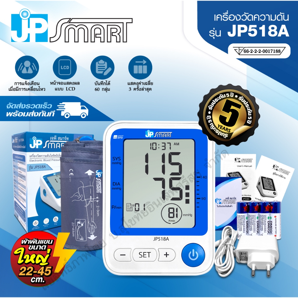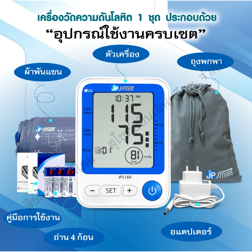 เครื่องวัดความดันโลหิต อิเล็กทรอนิกส์ รุ่น JP518A รับประกัน 5 ปี มาตรฐานสากล อุปกรณ์ครบในเซ็ต | JP Smart