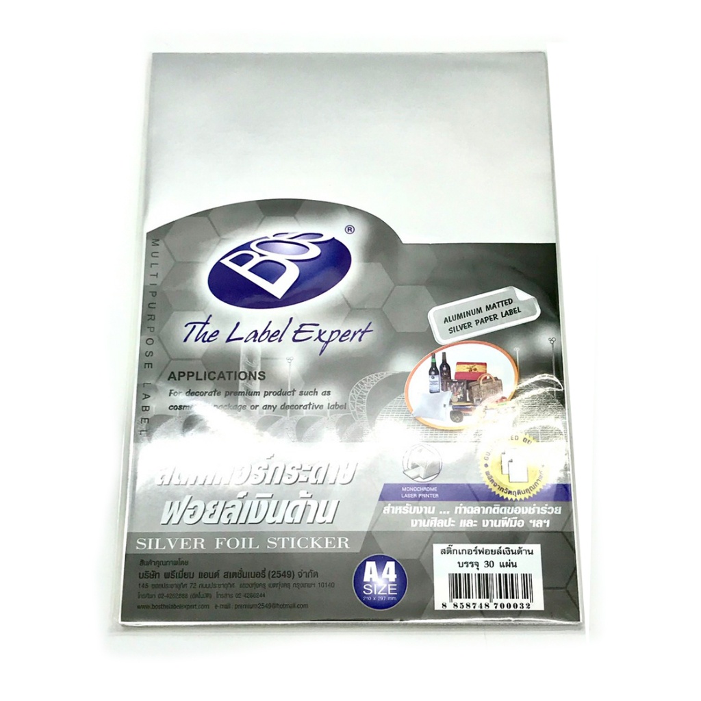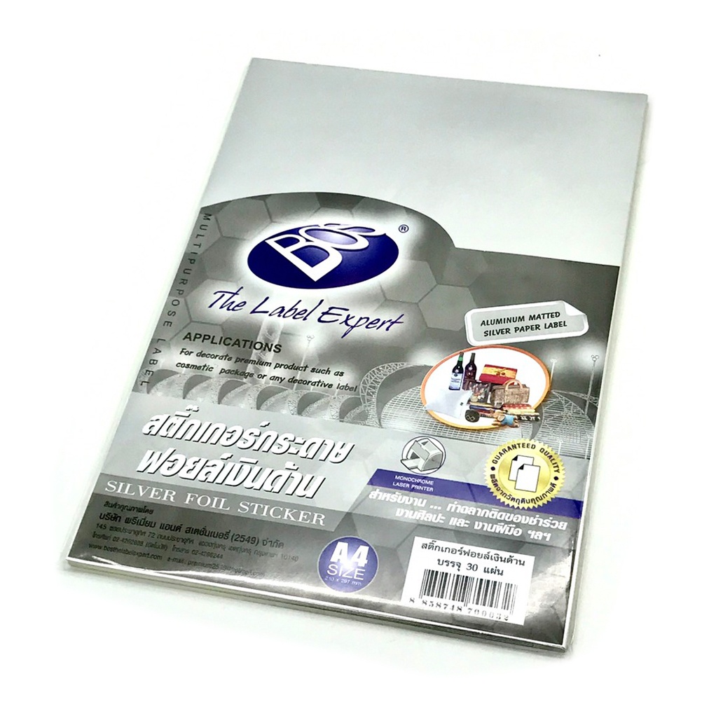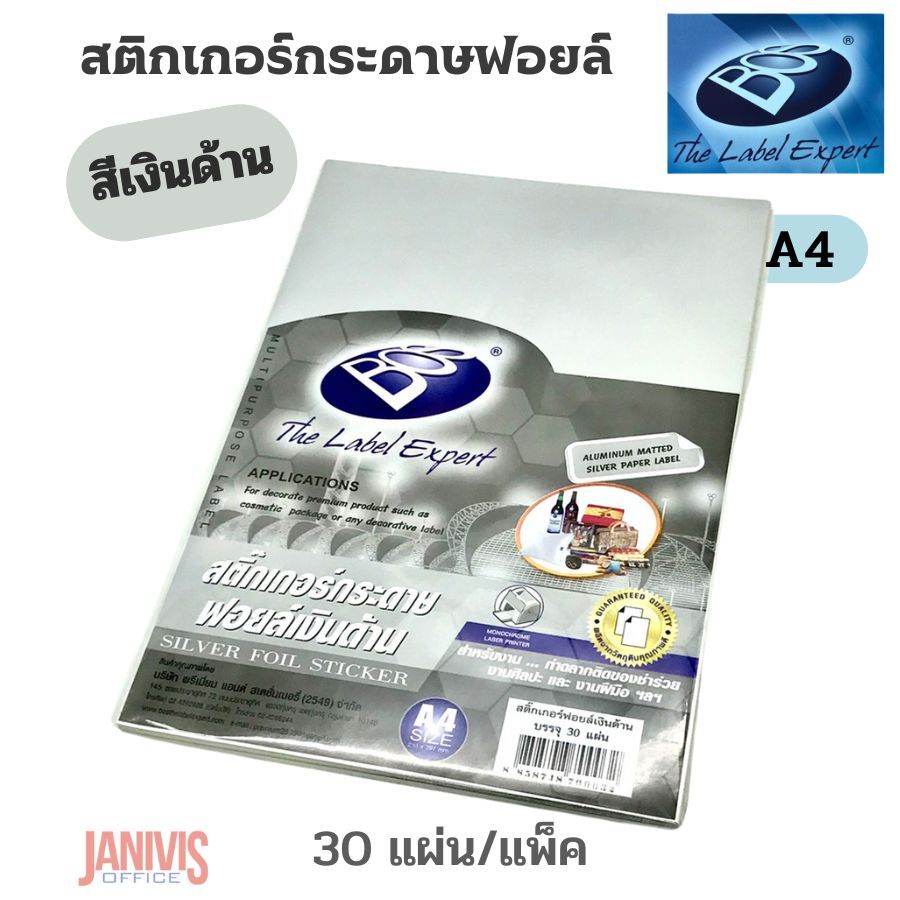 BOS สติกเกอร์กระดาษฟอยล์เงิน A4 (สีเงินด้าน) 30 แผ่น/แพ็ค