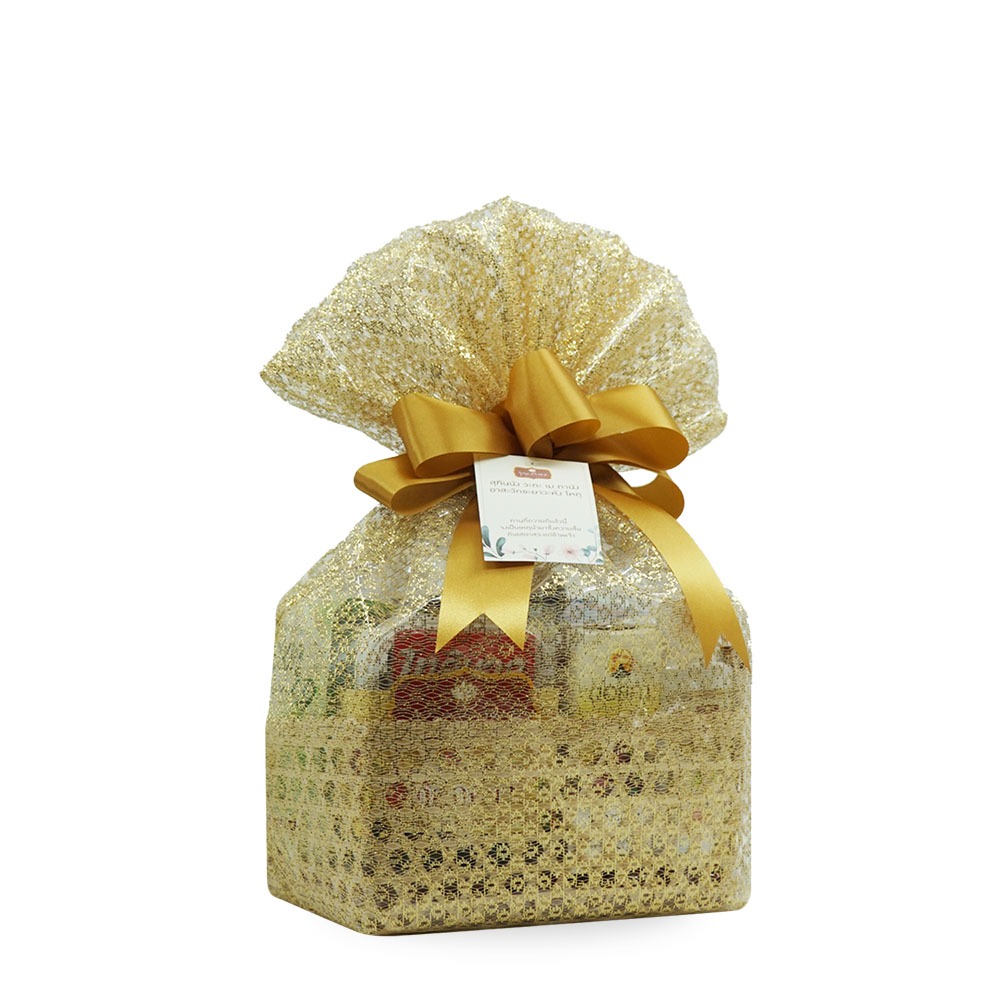 สังฆทานชุดสานบุญ 5 ตะกร้าสาน (โบว์ทอง) by บุญรักษา | ชุดสังฆทาน ชุดถวายพระ เครื่องไทยธรรม งานบวช งานแต่ง