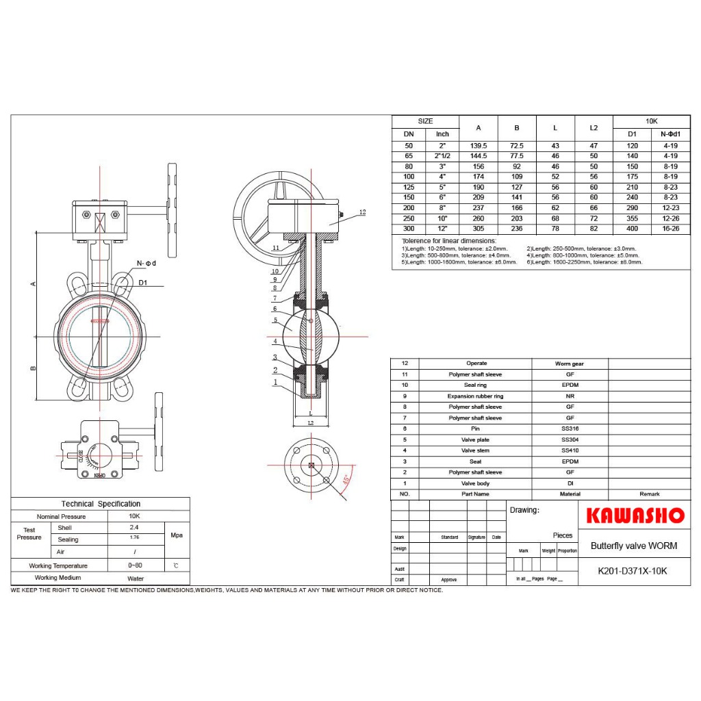 2" 2 1/2" 3" 4" 5" 6" 8" 10" 12" บัตเตอร์ฟลายวาล์ว ด้ามพวงมาลัย K201-D371X-10K ″KAWASHO″
