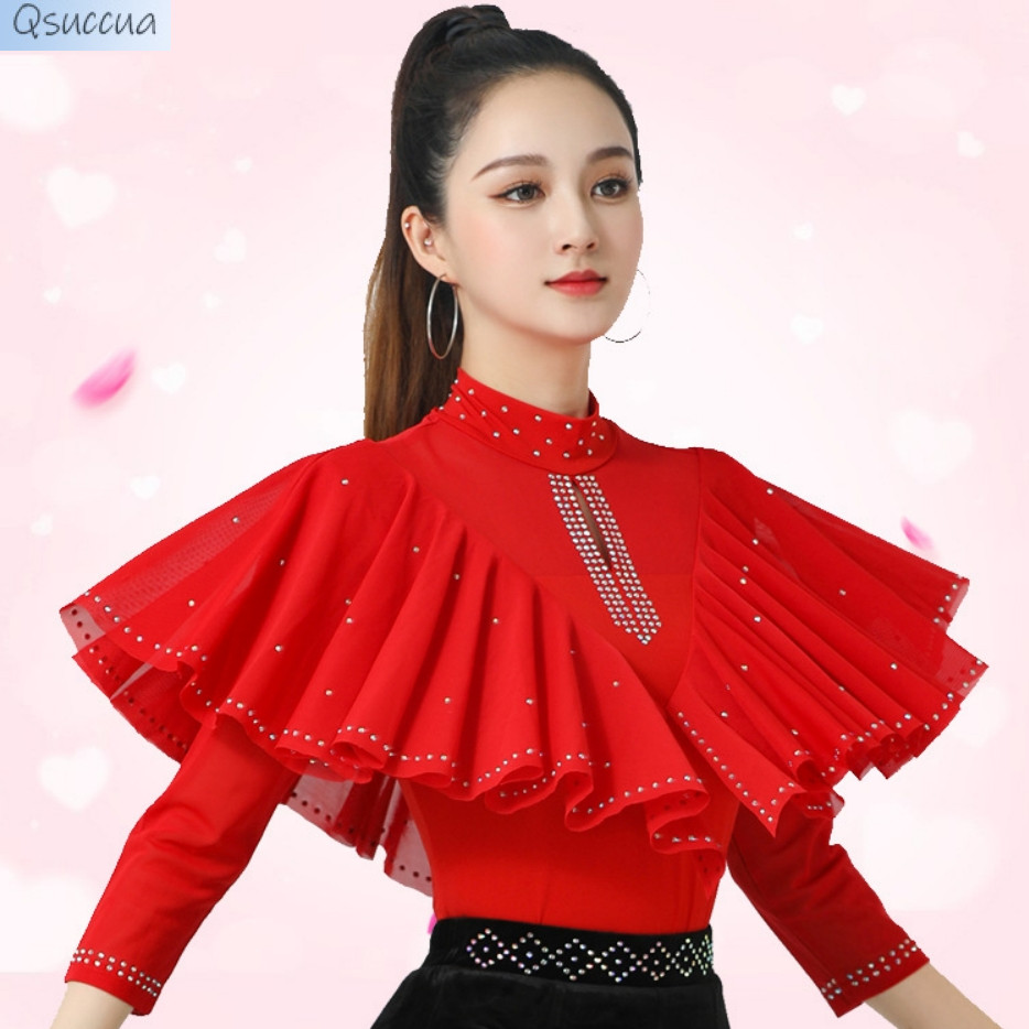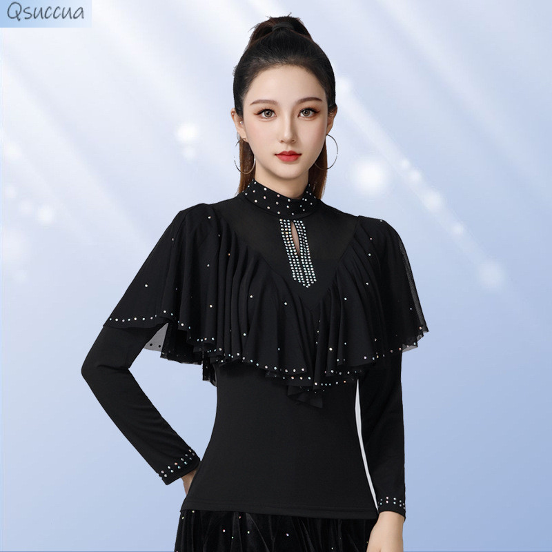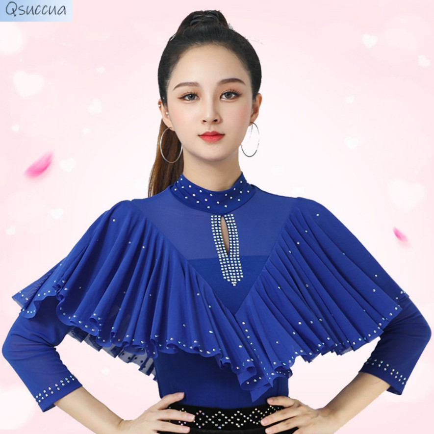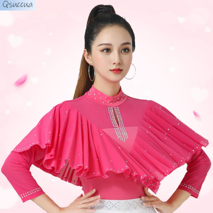 เสื้อแขนยาว คอตั้ง ประดับเพชร ทรงสี่เหลี่ยม เหมาะกับเต้นรําละติน หรูหรา สําหรับผู้ใหญ่