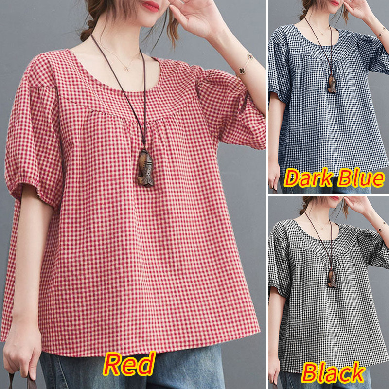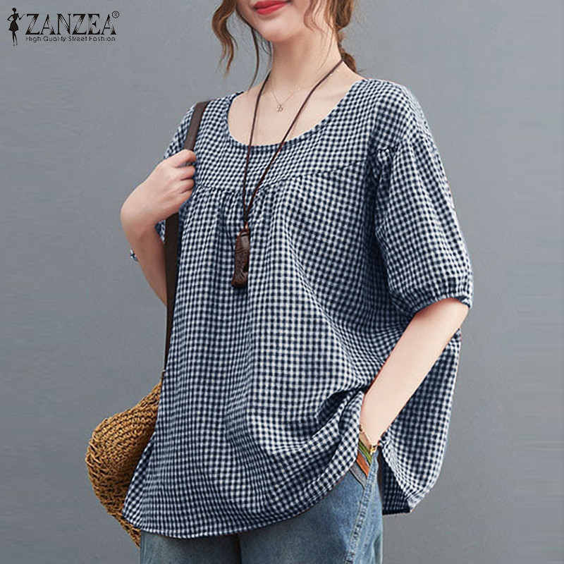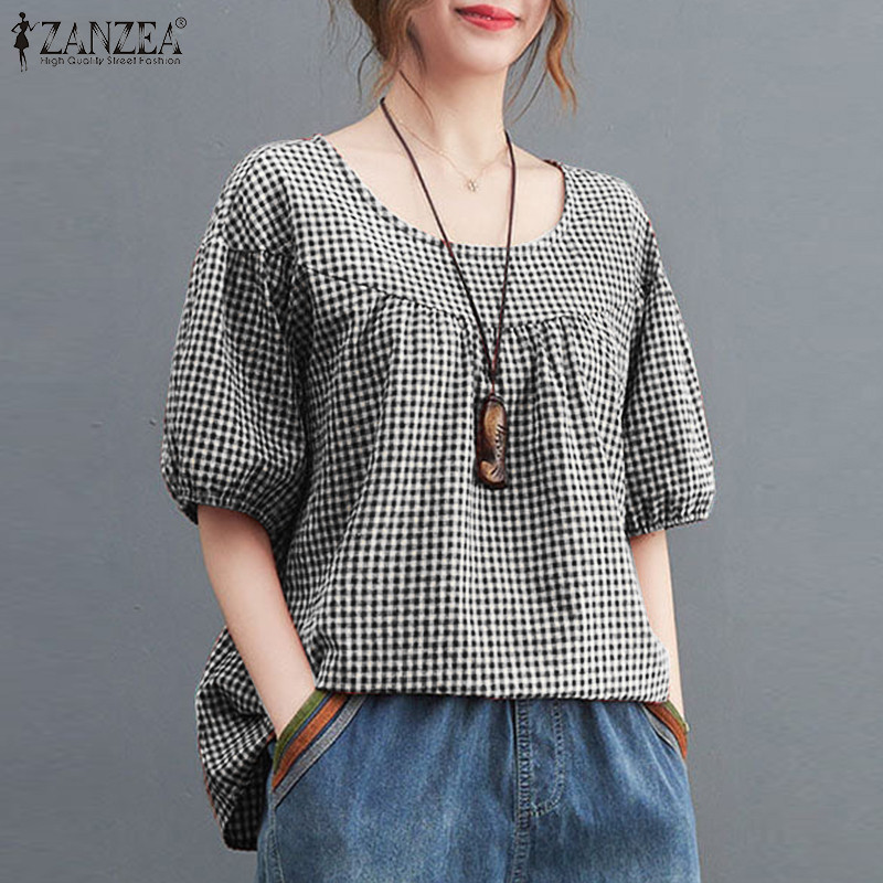 Zanzea ผู ้ หญิงเกาหลีลําลองคอกลมลายสก ๊ อตจีบโคมไฟแขนเสื ้ อ