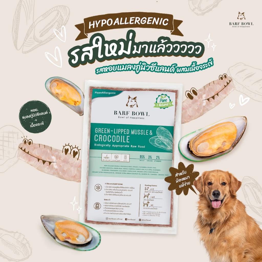 บาร์ฟสุนัข - BARF(สูตรแพ้ง่าย) หอยแมลงภู่นิวซีแลนด์ผสมจระเข้ l 500g - (HypoAllergenic) GREEN-LIP
