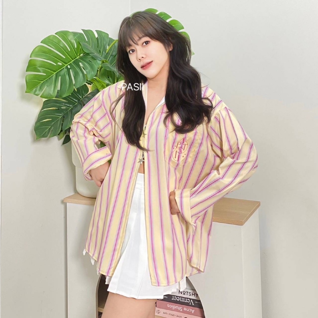 เสื้อเชิ๊ตซิปหน้าแขนยาวลายริ้วปักกระเป๋า