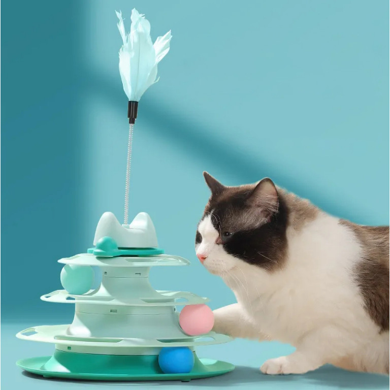 【4ชั้น】เครื่องให้อาหารแมวตลกของเล่นแทร็กลูกบอลฐานของเล่นแบบโต้ตอบสำหรับลูกแมวในร่ม ของเล่นแมว