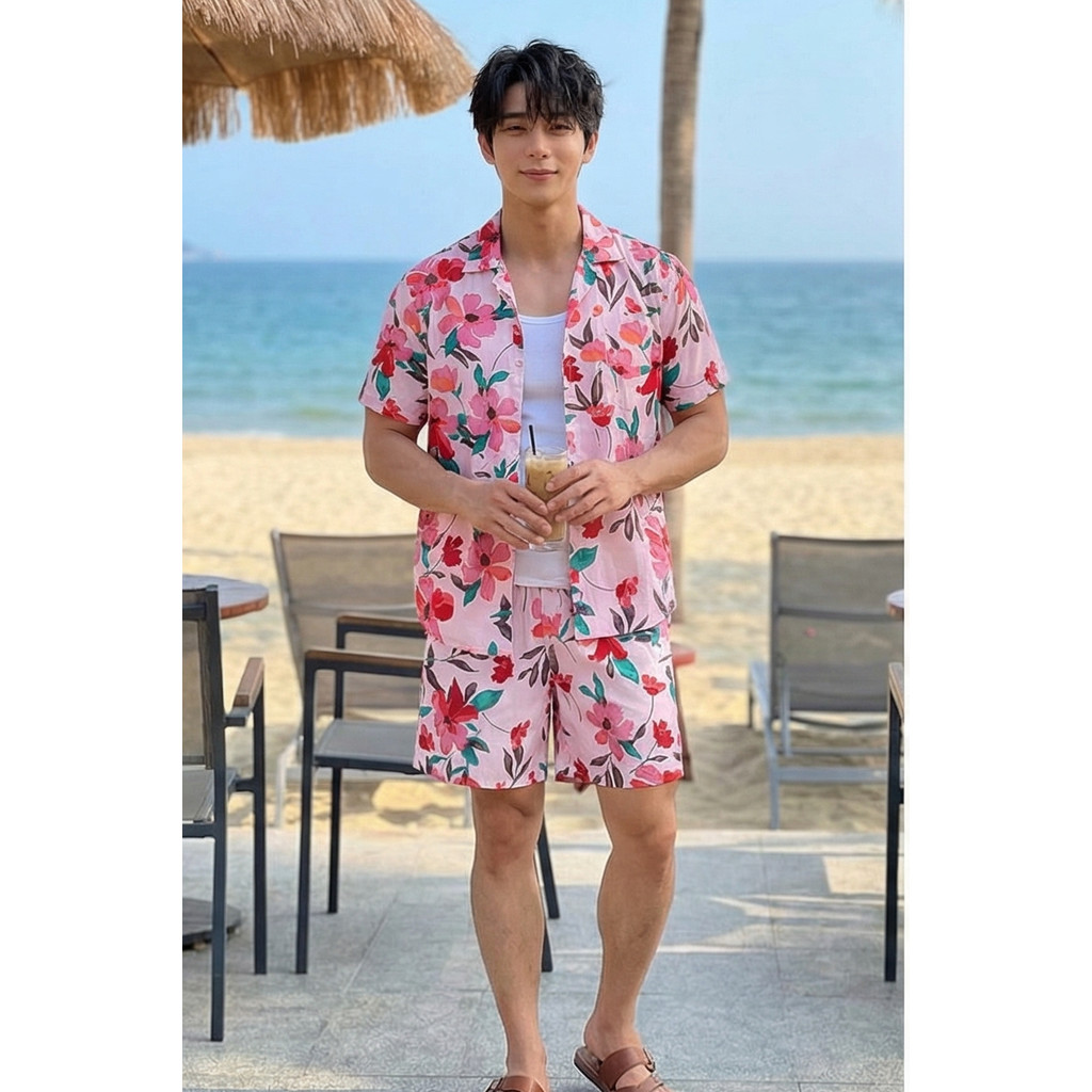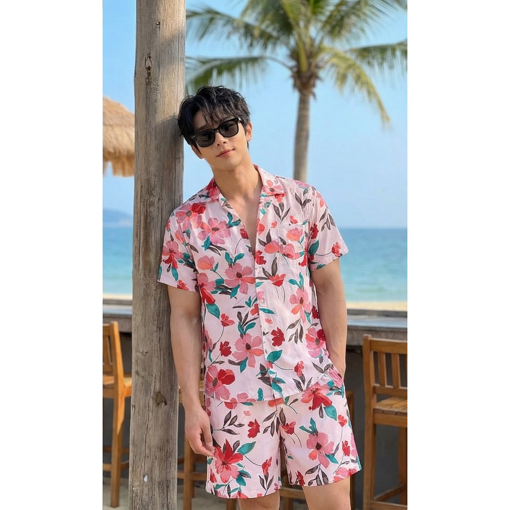 เสื้อสงกรานต์ ลายดอกเซ็ต2ชิ้น เสื้อคอปกแขนสั้นกระดุมหน้าสีชมพูลายดอกไม้+กางเกงขาสั้นเอวยางยืด #hw8006