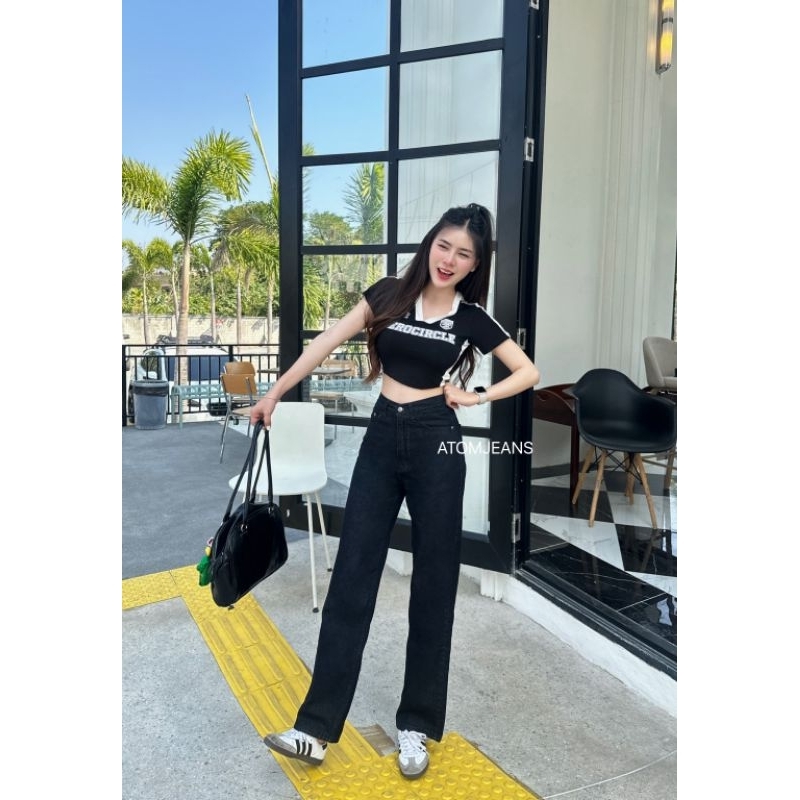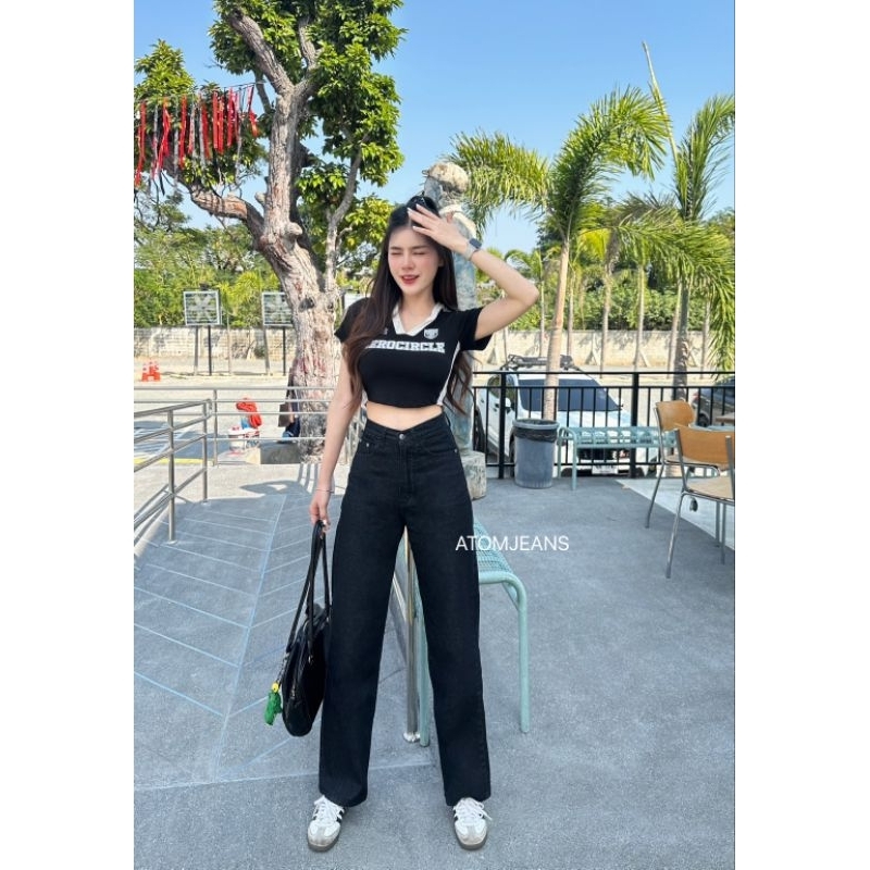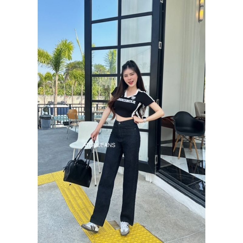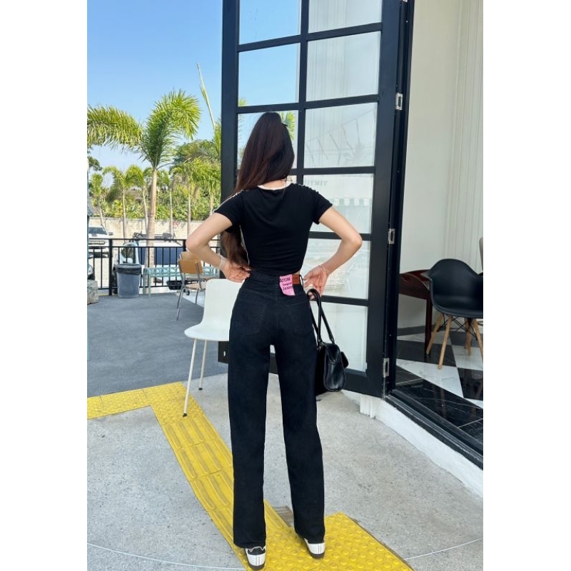กางเกงยีนส์ขากระบอกเอวสูง สีสนิม งานป้ายอะตอม