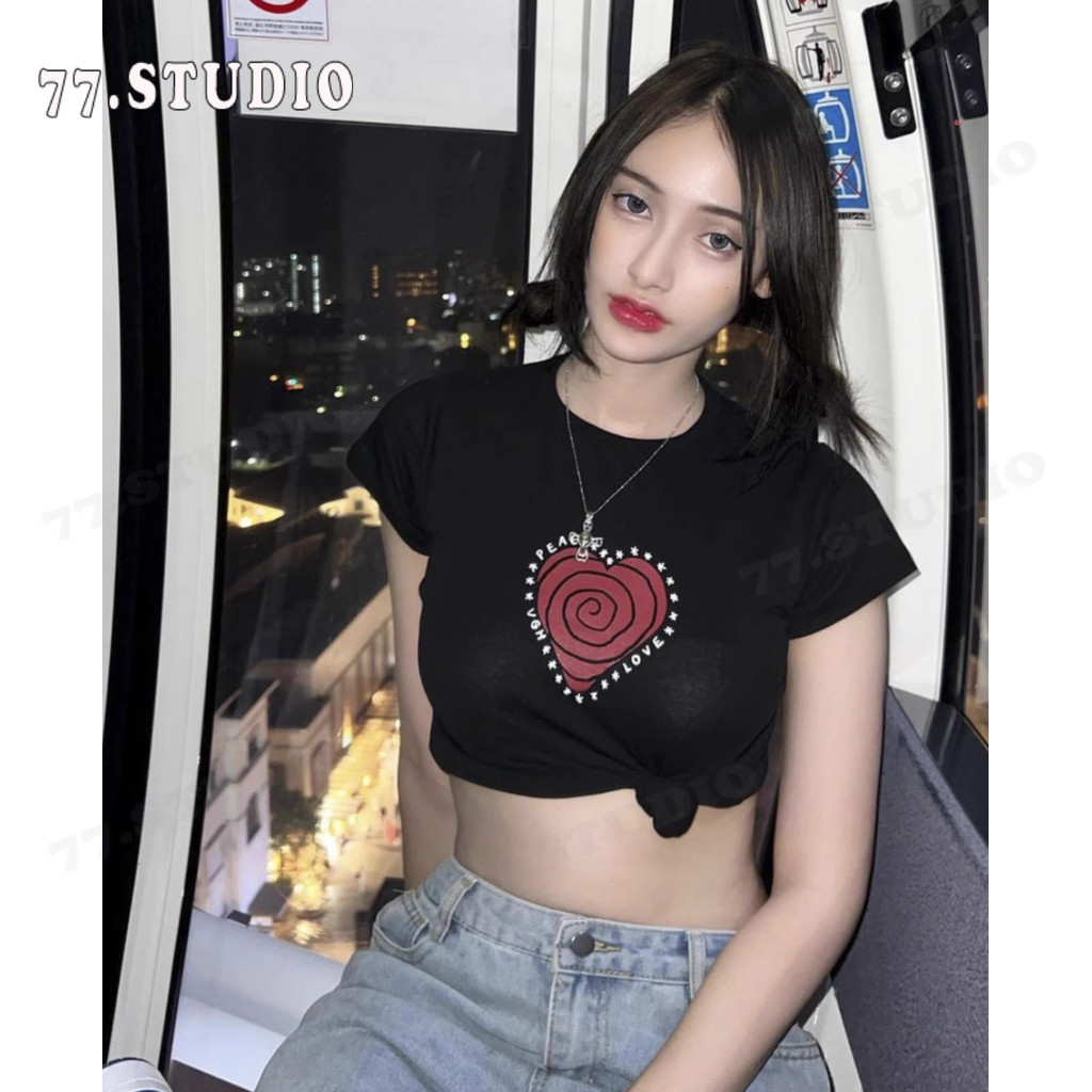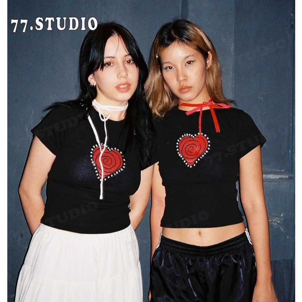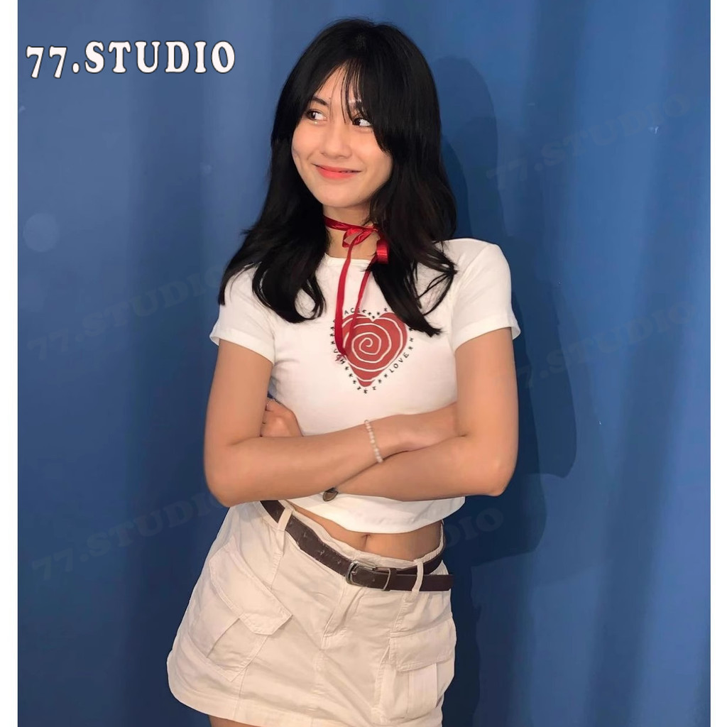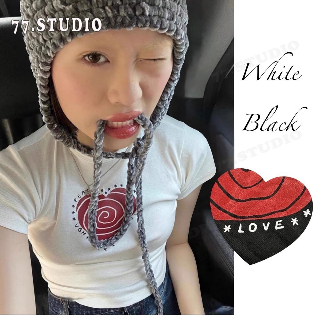 (พร้อมส่งจากกทม มาถึงใน 2วัน)baby tee เสื้อครอปท็อป แขนสั้น พิมพ์ลายหัวใจ แบบสวมหัว แฟชั่นฤดูร้อน สําหรับผู้หญิง