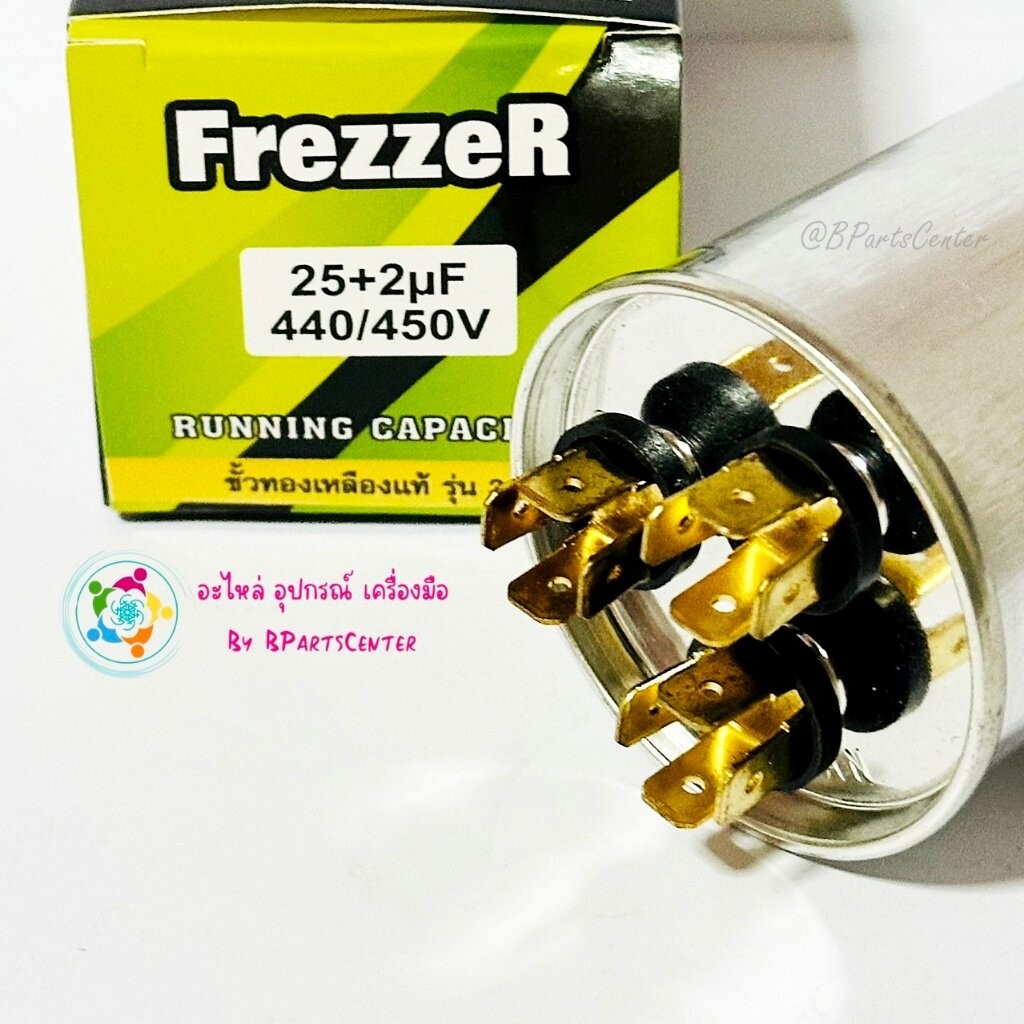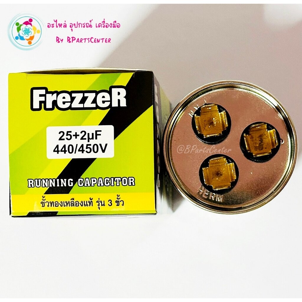 *** ออกใบกำกับภาษีได้ *** FrezzeR แคปรันแอร์ค่า 25 + 2 UF +-5% Capacitor (440/450V 50/60 Hz) ขั้วทองเหลืองแท้ 3 ขั้ว
