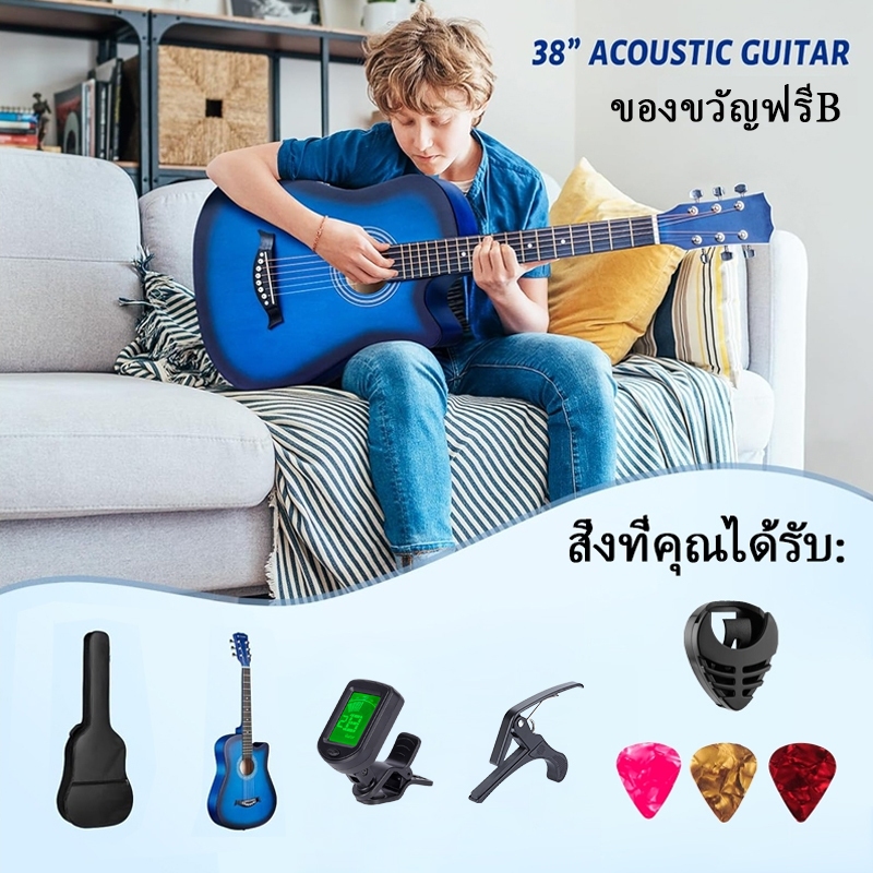 กีต้าร์โปร่ง ขนาด 38 นิ้ว ไม้Basswood เหมาะสำหรับมือใหม่ แข็งแรง พกพาสะดวก สตริงได้รับการปรับแล้ว