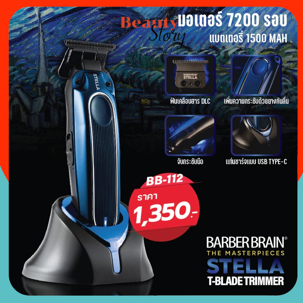 Barber Brain Trimmer ปัตตาเลี่ยน กันขอบ ไร้สาย รุ่น Stella BB-112 T-Blade (สเตลล่า) ฟัน Zero-Cut พร้อมชุดรอง แท่นชาร์จ