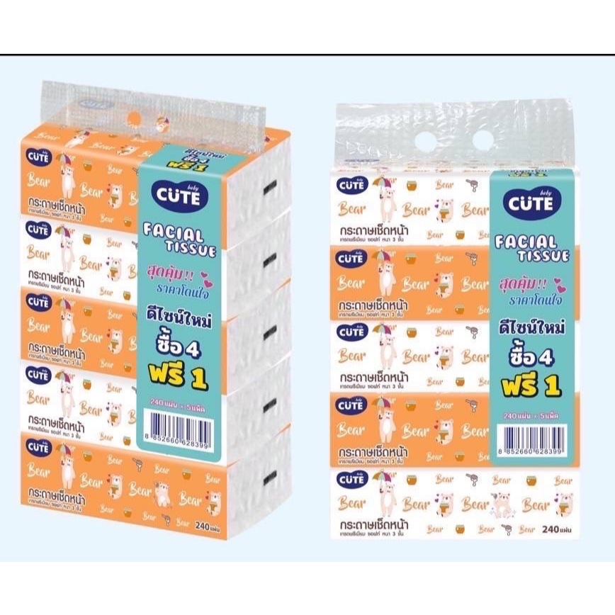 3 แพ็ค Baby Cute กระดาษทิชชูเช็ดหน้า เช็ดผิว (รวม 15 ห่อ) หนานุ่ม 3 ชั้น ซึมซับได้ดี่เยี่ยม ไม่ขาดง่าย ไม่เป็นขุย