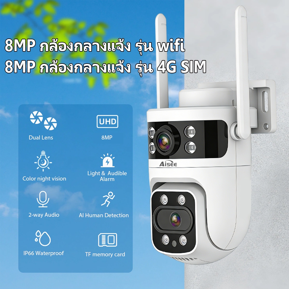 4K เลนส์คู่ กล้องวงจรปิดใส่ซิมเน็ต 4G กล้องใส่ซิม 4G กล้องวงจรปิด 8MP กันน้ำ IP67 กลางคืนภาพสี