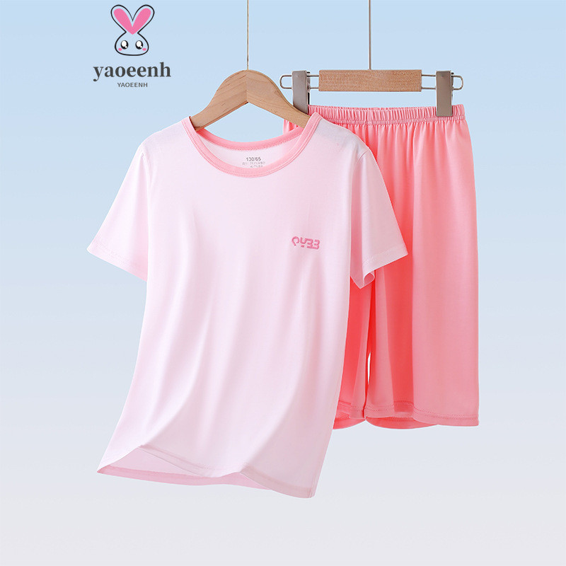 【YAOEENH】100-170 ซม. ฤดูร้อน เด็ก สีพื้น ชุดเครื่องปรับอากาศ ลําลอง ขนาดกลาง ขนาดใหญ่ เด็กผู้ชาย เด็กผู้หญิง แขนสั้น กางเกงขาสั้น ชุดนอน สองชิ้น พร้อม