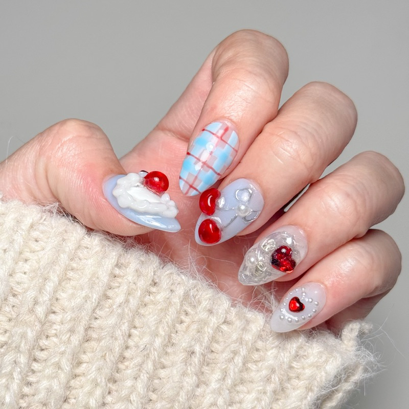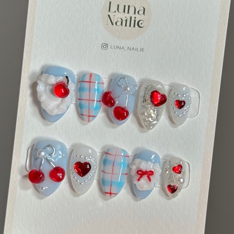 cherry nail 🍒 เล็บปลอมเชอร์รี่ โทนฟ้าแดง🩵❤️ | Luna_Nailie