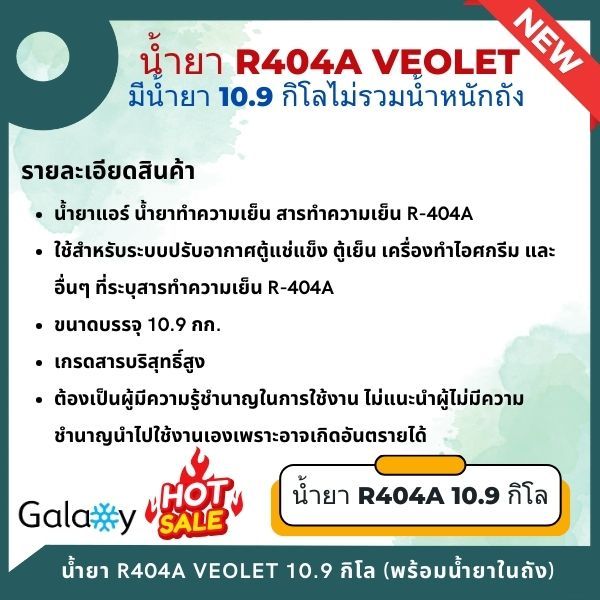 น้ำยาทำความเย็น R-404a ยี่ห้อ Veolet บรรจุน้ำยา 10.9 กิโลกรัม (มีน้ำยา 10.9 กิโลกรัม ไม่รวมน้ำหนักถัง) **ถูกที่สุด**
