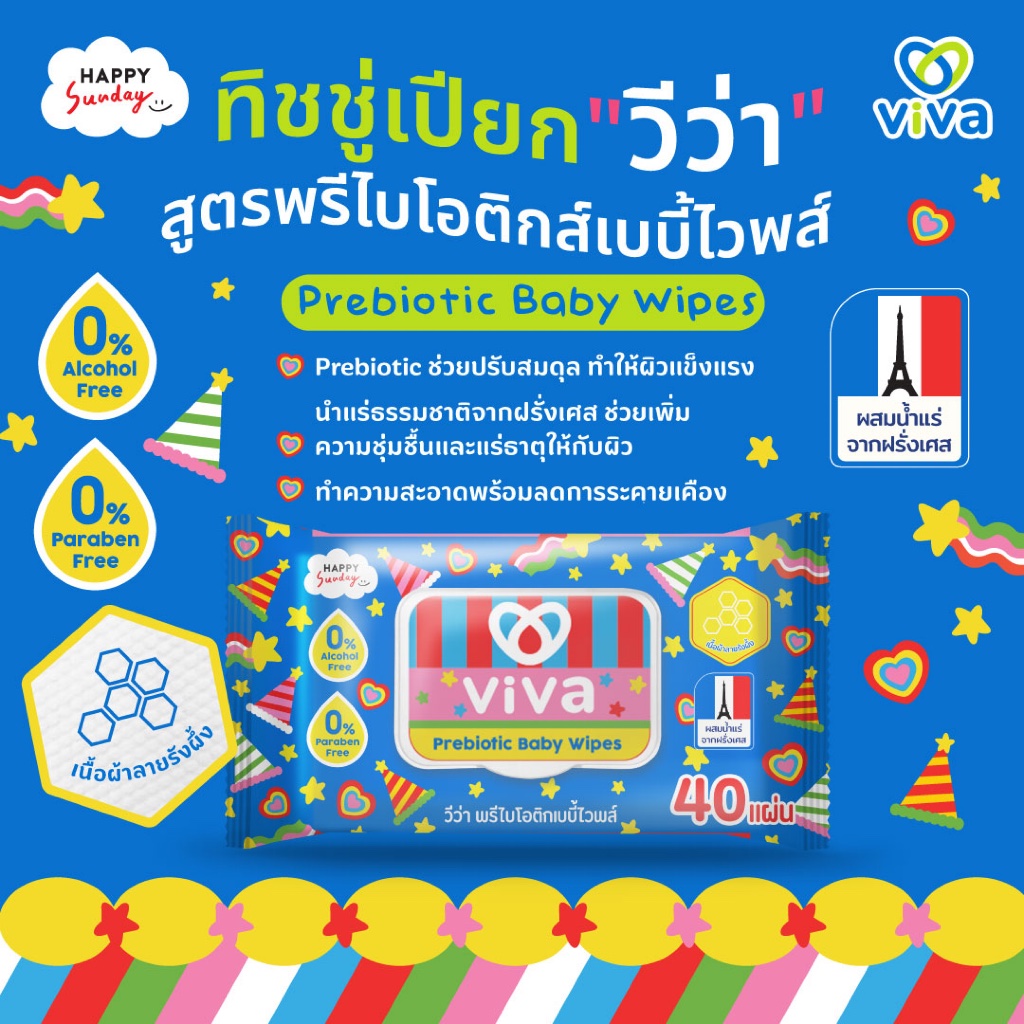 ViVa x Happy Sunday วีว่า Prebiotic Baby Wipes 40 แผ่น แพ็ค 6 ห่อ ทิชชู่เปียก สูตรพรีไบโอติกส์