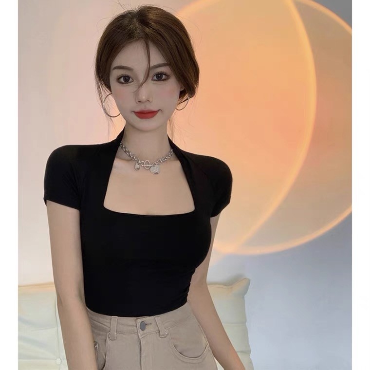 【WJZ】เสื้อยืดคอเหลี่ยมแขนสั้นสีพื้นสไตล์เกาหลีสำหรับผู้หญิง【t78#】