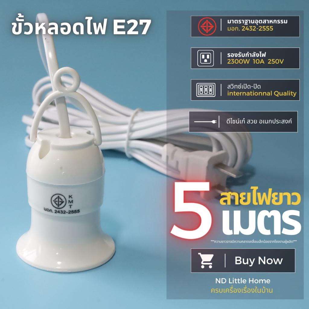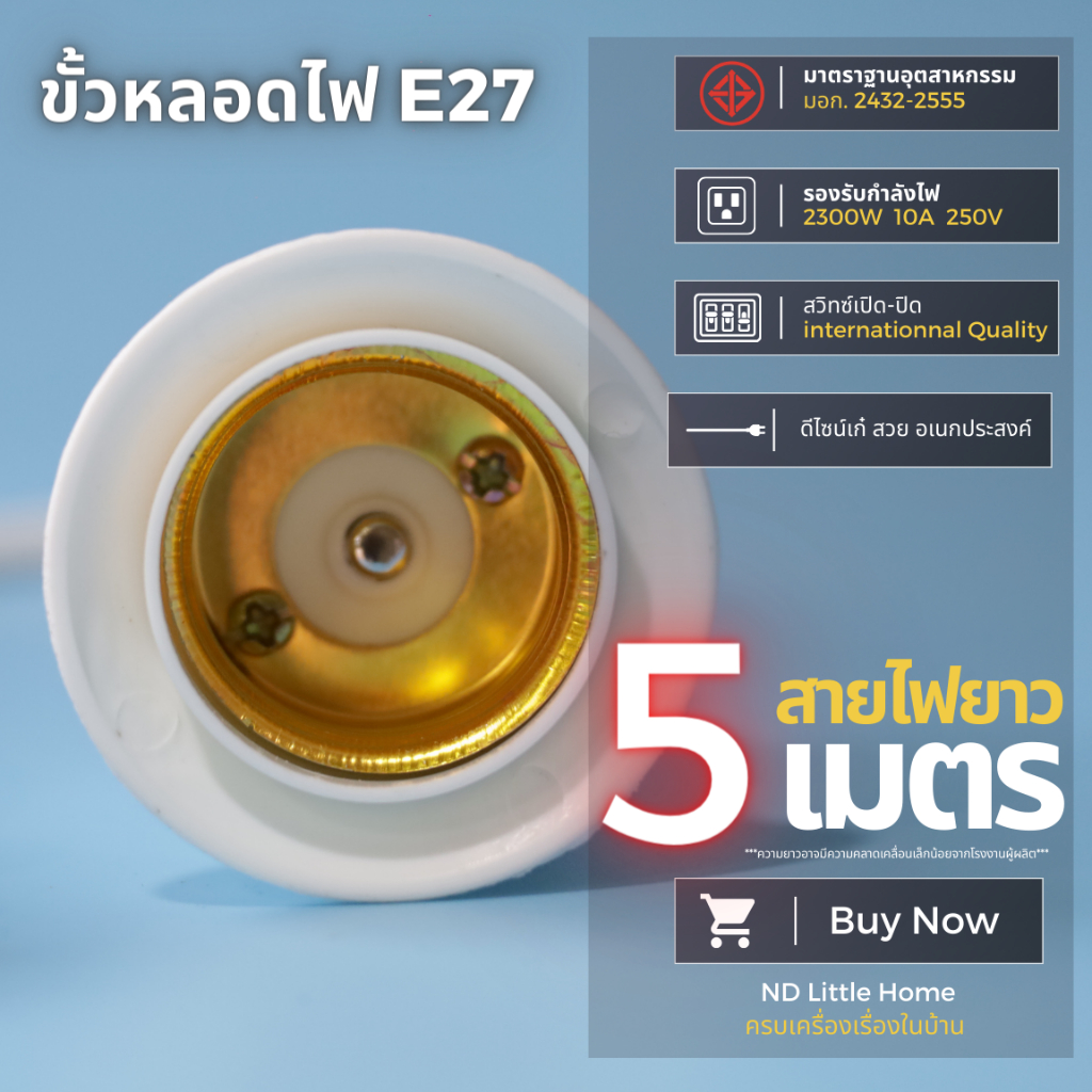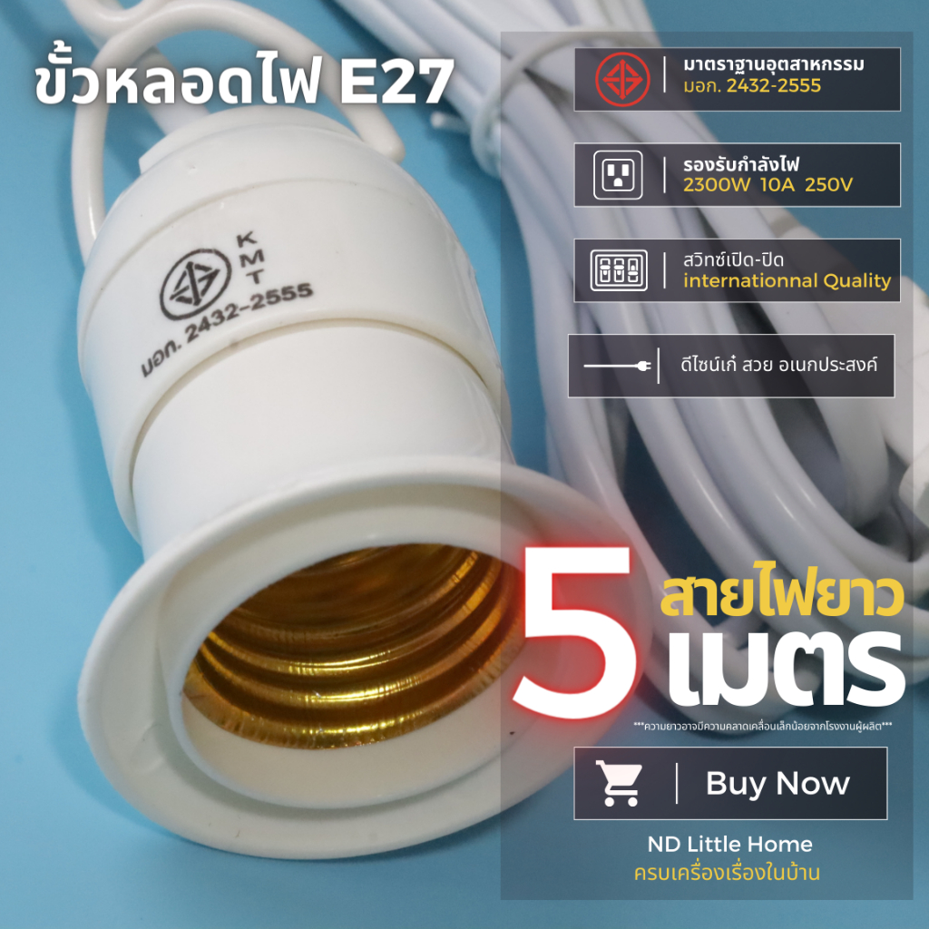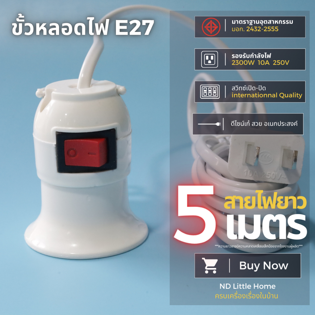 ขั้วหลอดไฟ E27 มี มอก. มีสวิตซ์เปิด-ปิด พร้อมสายไฟมีปลั๊กเสียบ ยาว 5 เมตร