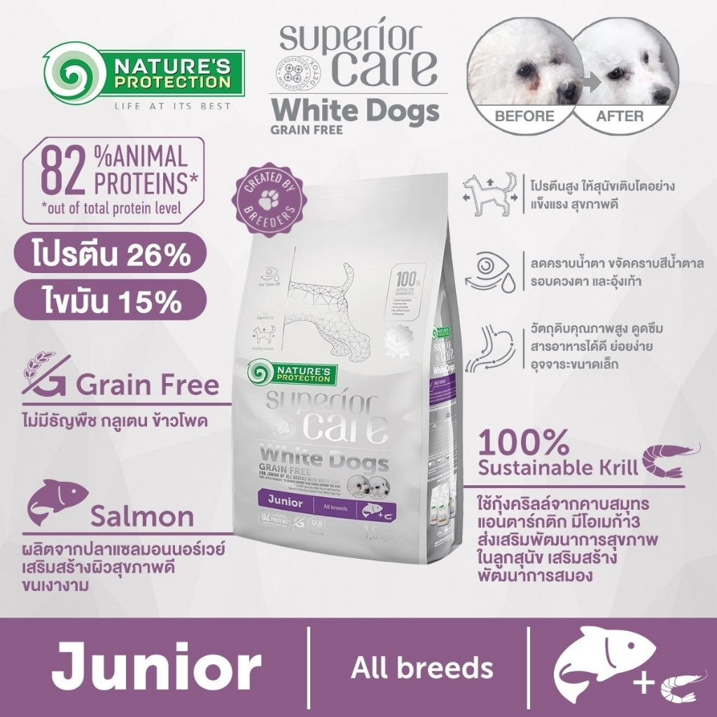[ขนาด 1.5kg] Nature's Protection White Dogs อาหารสุนัขเกรนฟรี สำหรับสุนัขขนขาว