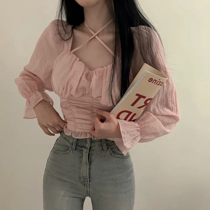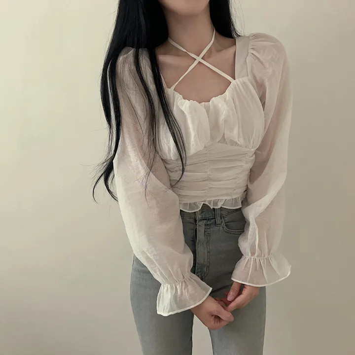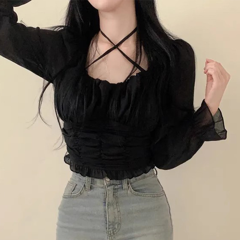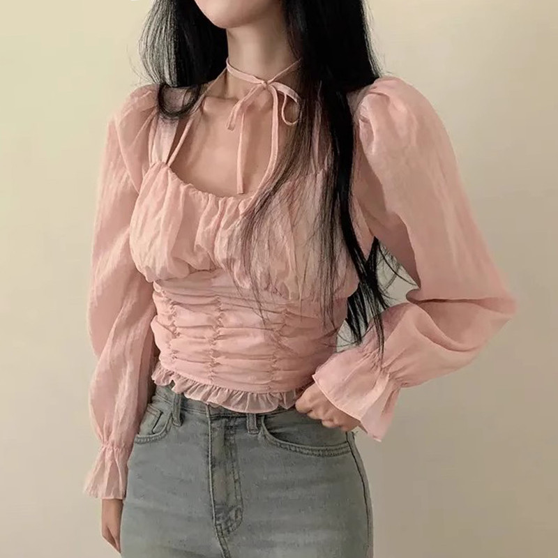 Bh เสื ้ อครอปชีฟองผู ้ หญิงสไตล ์ เกาหลีคอปกสี ่ เหลี ่ ยมผูกจีบเสื ้ อแขนยาว