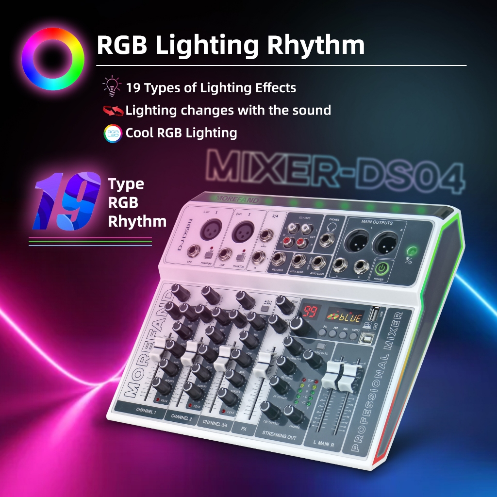 มิกเซอร์เสียง RGB Rhythm Mixer-DS04 19 โหมดสี LED ปรับแสงตามดนตรี! พร้อมพอร์ต XLR/TRS หน้าจอดิจิตอล สำหรับสตูดิโอ/งานอีเ