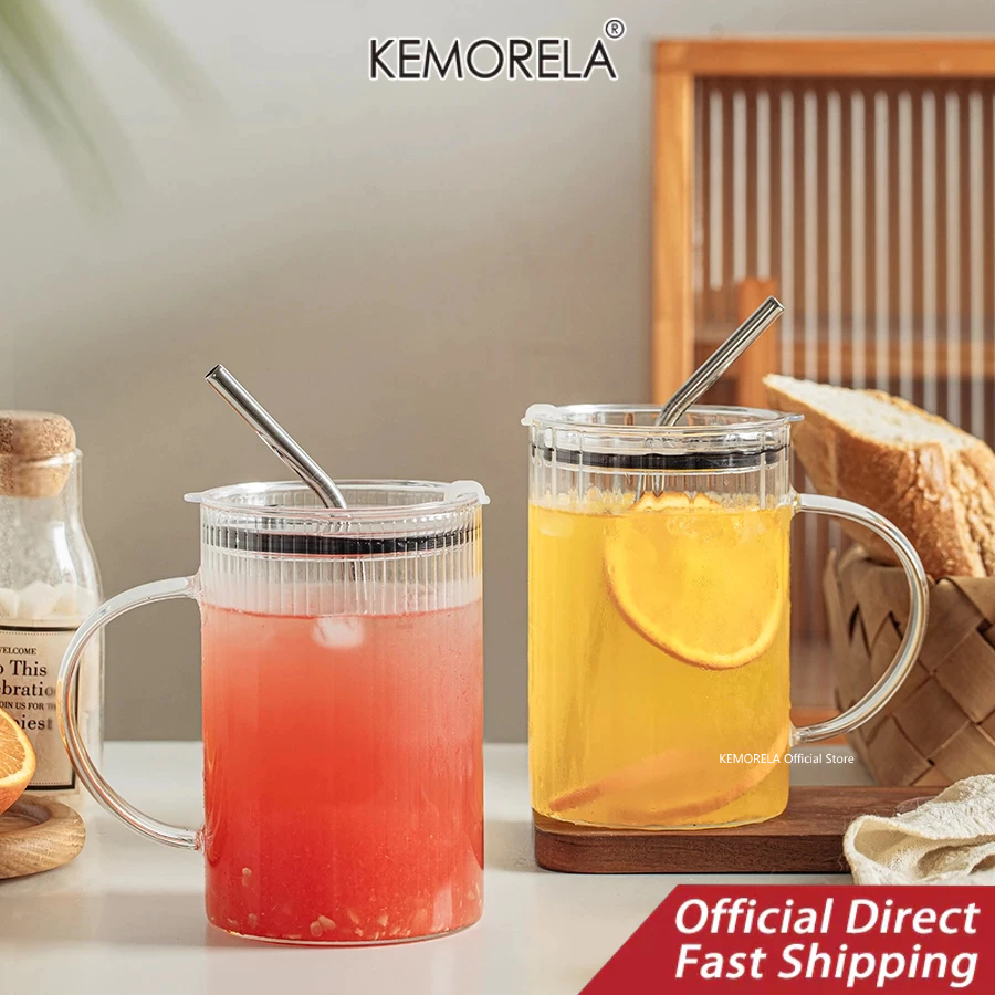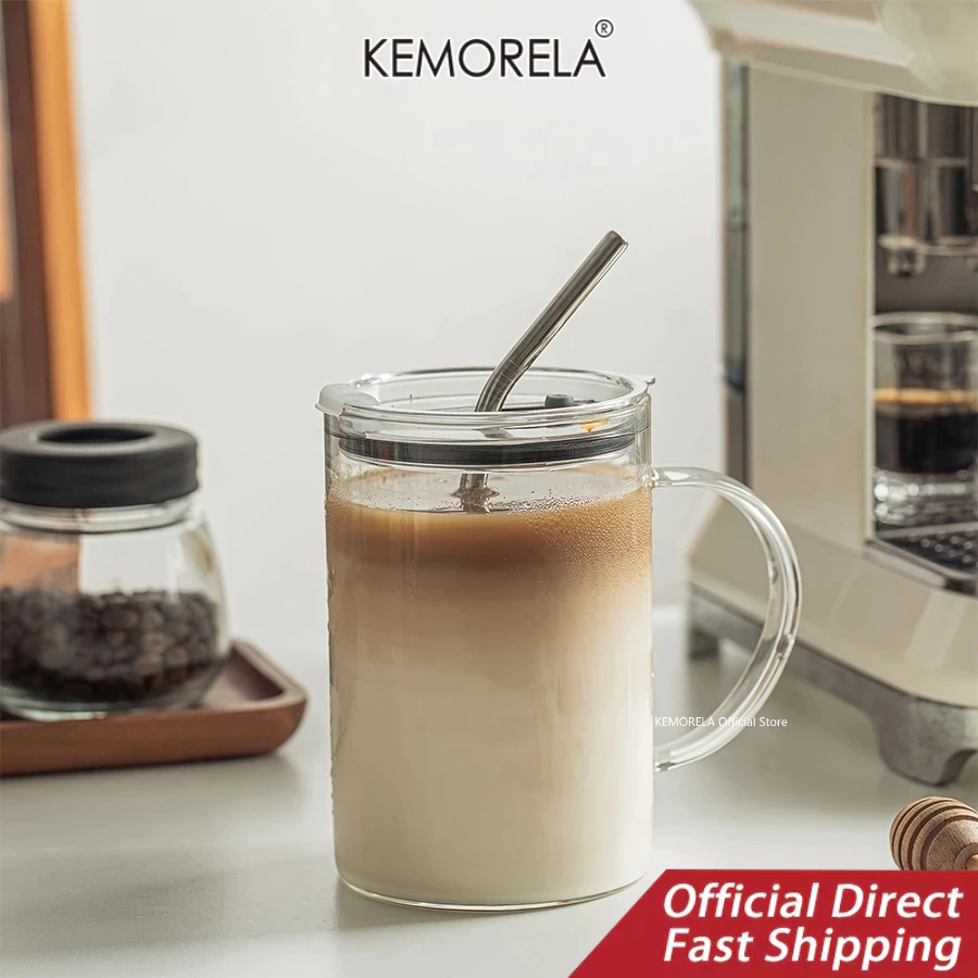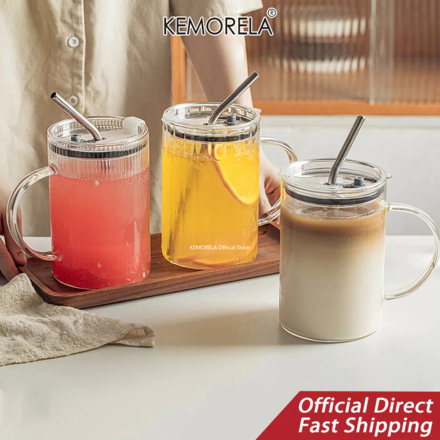 KEMORELA ถ้วยแก้วใสถ้วยแก้วขนาดใหญ่พร้อมฝาและหูจับ1000มลถ้วยดื่มพร้อมฝาปิดและหลอดแก้วดื่มใช้ในครัวเรือนสําหรับใช้ในบ้านสํานักงานถ้วยแก้วทนความ