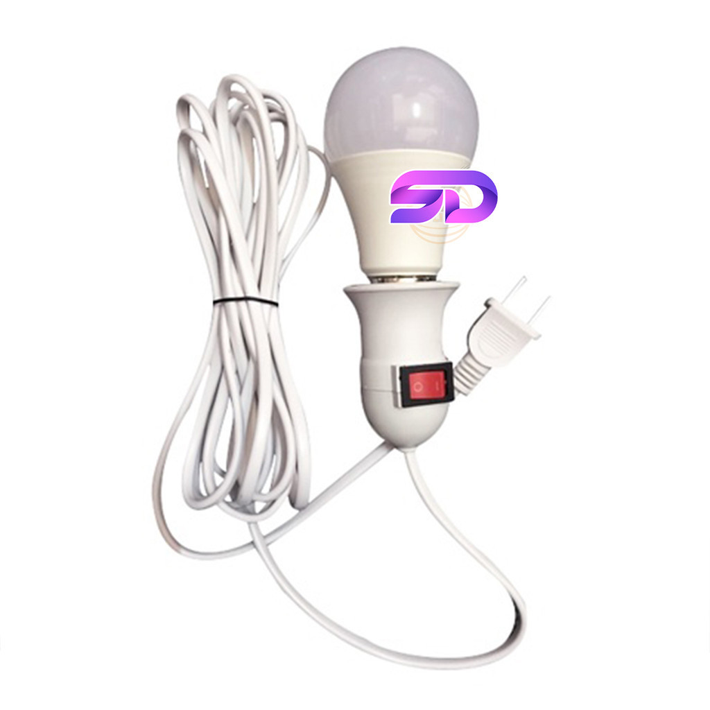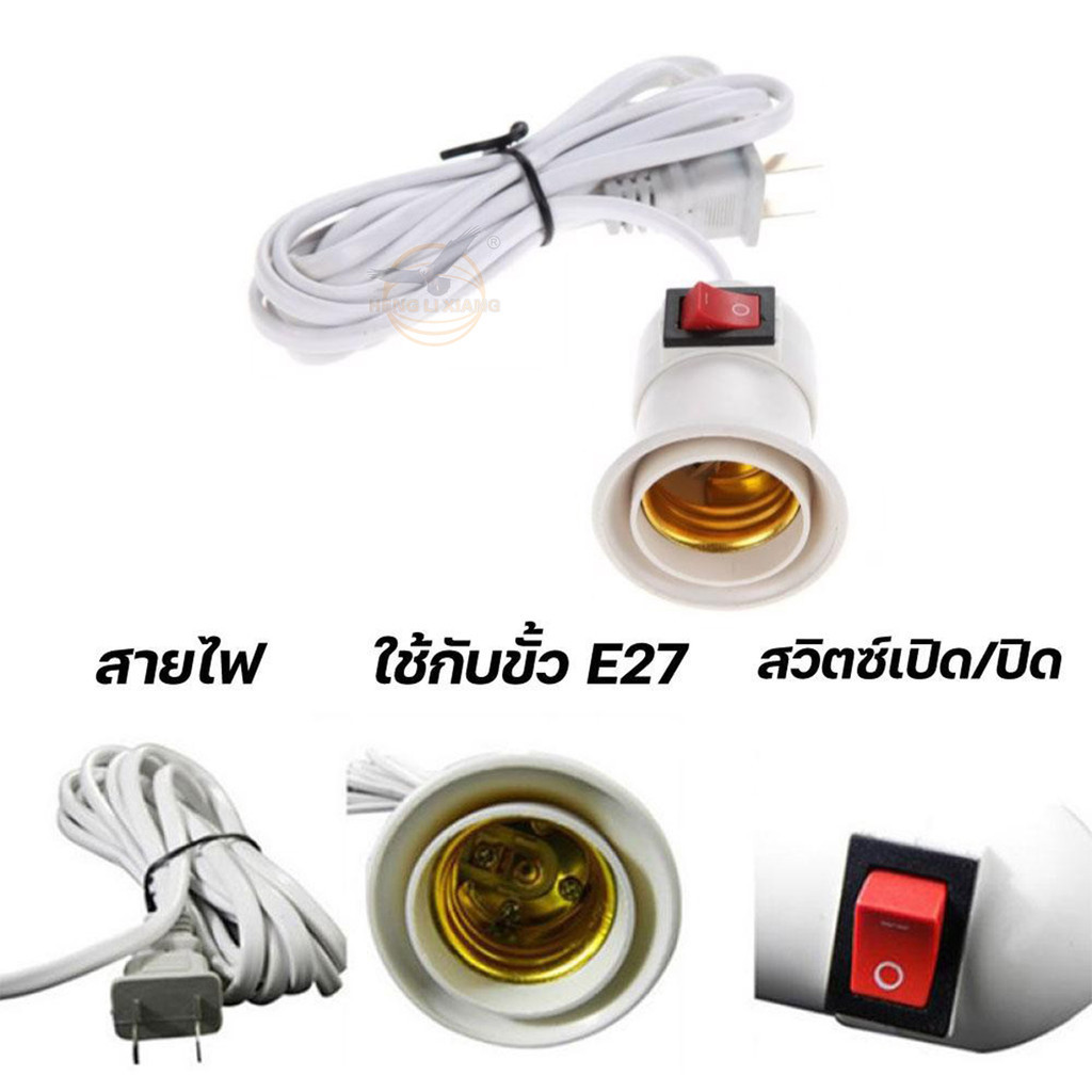 ขั้วหลอดไฟ E27 พร้อมสายไฟมีปลั๊กเสียบ ยาว 5/10 เมตร (ไม่รวมหลอดไฟ) สายสีขาว ขั้วสายไฟ มีสวิตซ์