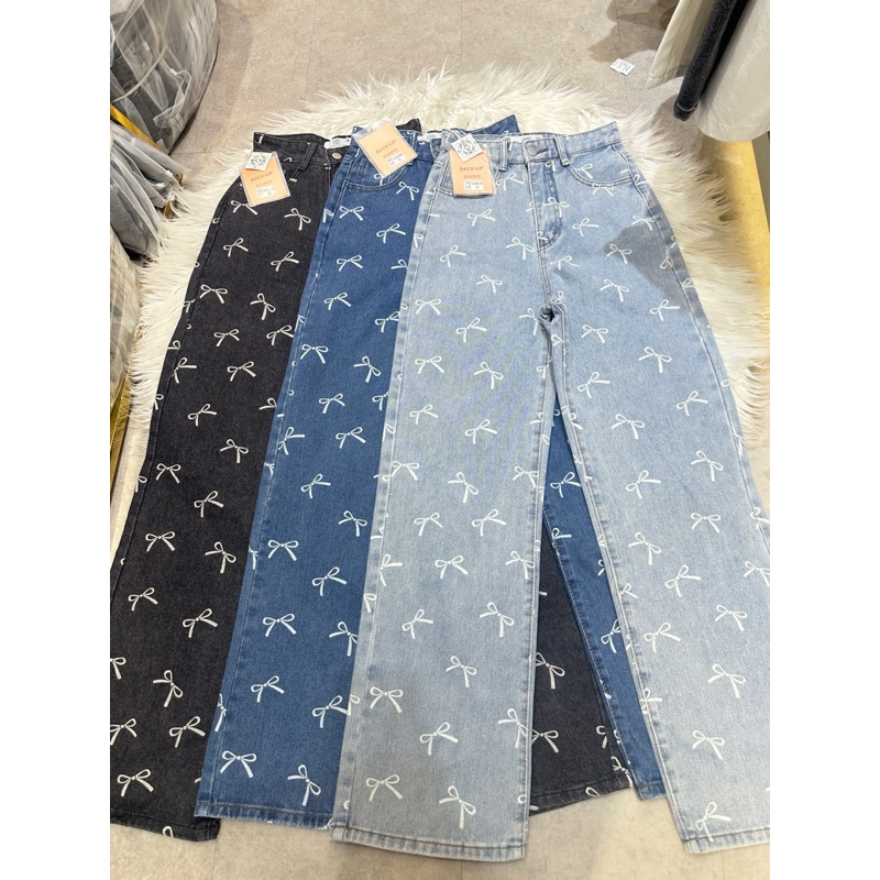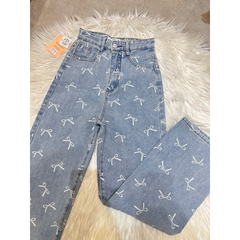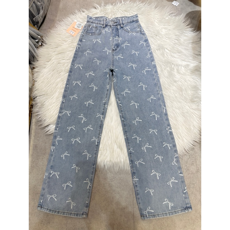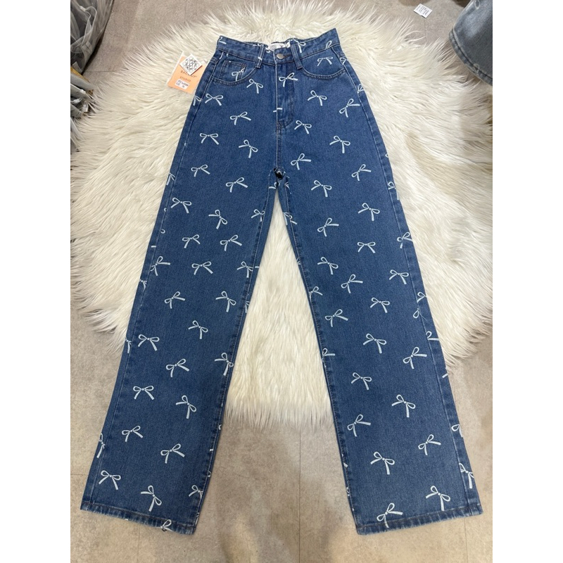 🎀กางเกงยีนส์ขากระบอกพิมพ์ลายโบว์ขาว กางเกงยีนส์เอวสูงทรงสวยใส่เที่ยวเก๋