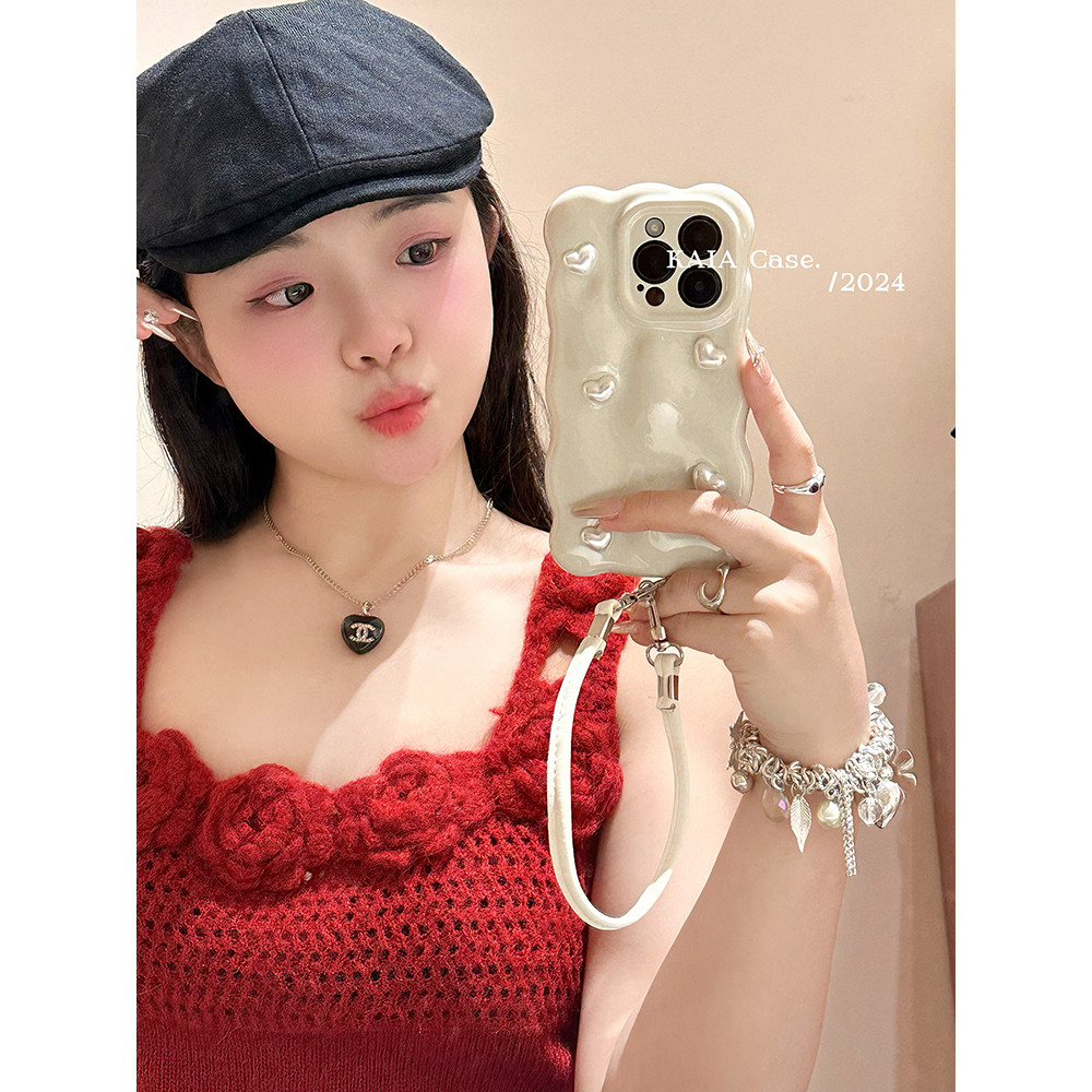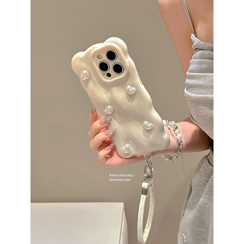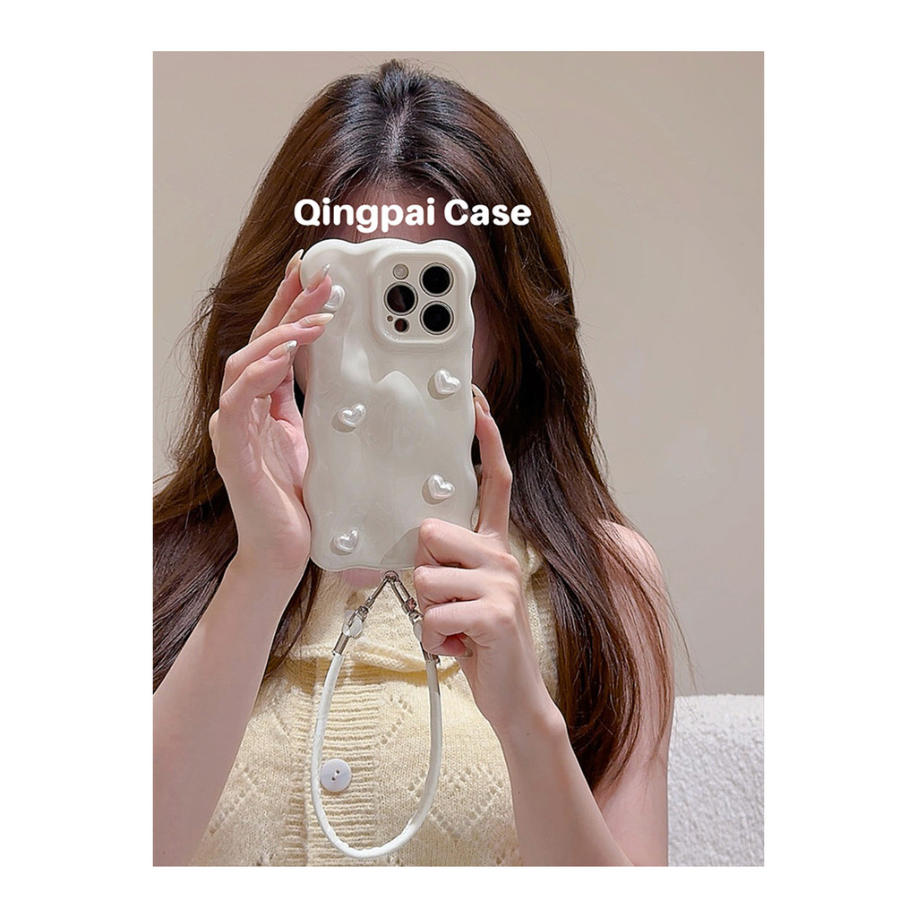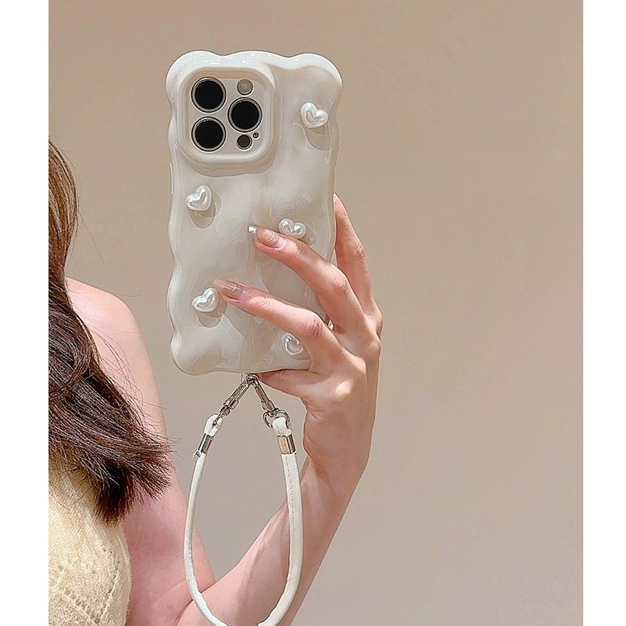 Pearl Love Heart คลื่นสีขาว Wrsit สายคล้องเคสโทรศัพท์สําหรับ iPhone 17Promax 12 13 14 15 16 ProMax 11 ซิลิโคนอ่อนนุ่มกันกระแทกผู้หญิงฝาครอบมือถือ