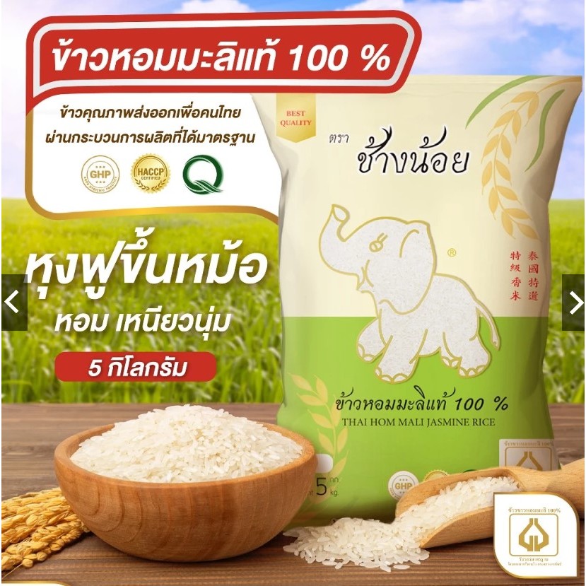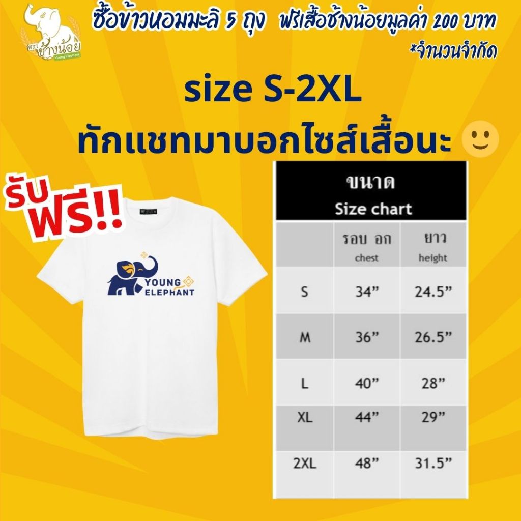ส่งฟรี แถมเสื้อ ข้าวหอมมะลิแท้100% (ข้าวใหม่ต้นฤดู) ตราช้างน้อย ขนาด 5 กก. (5 แพค)