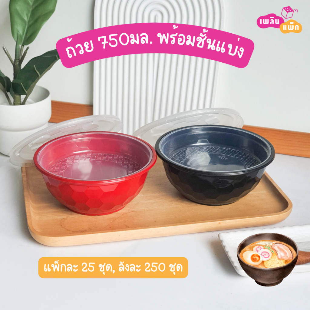 ชามพลาสติกพร้อมฝา ใส่ราเมน ข้าวหน้าต่างๆ มีช่องแบ่ง และ ไม่มีช่องแบ่ง ขนาด 750 ML. แพ็กละ 25 ชุด