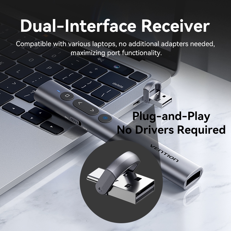 Vention เครื่องนำเสนอ PowerPoint ไร้สาย เลเซอร์สีแดง ควบคุมได้ 50m 2.4G Type-C/USB พร้อมที่เก็บแม่เหล็ก สำหรับคอมพิวเตอร์/แท็บเล็ต/โทรศัพท์