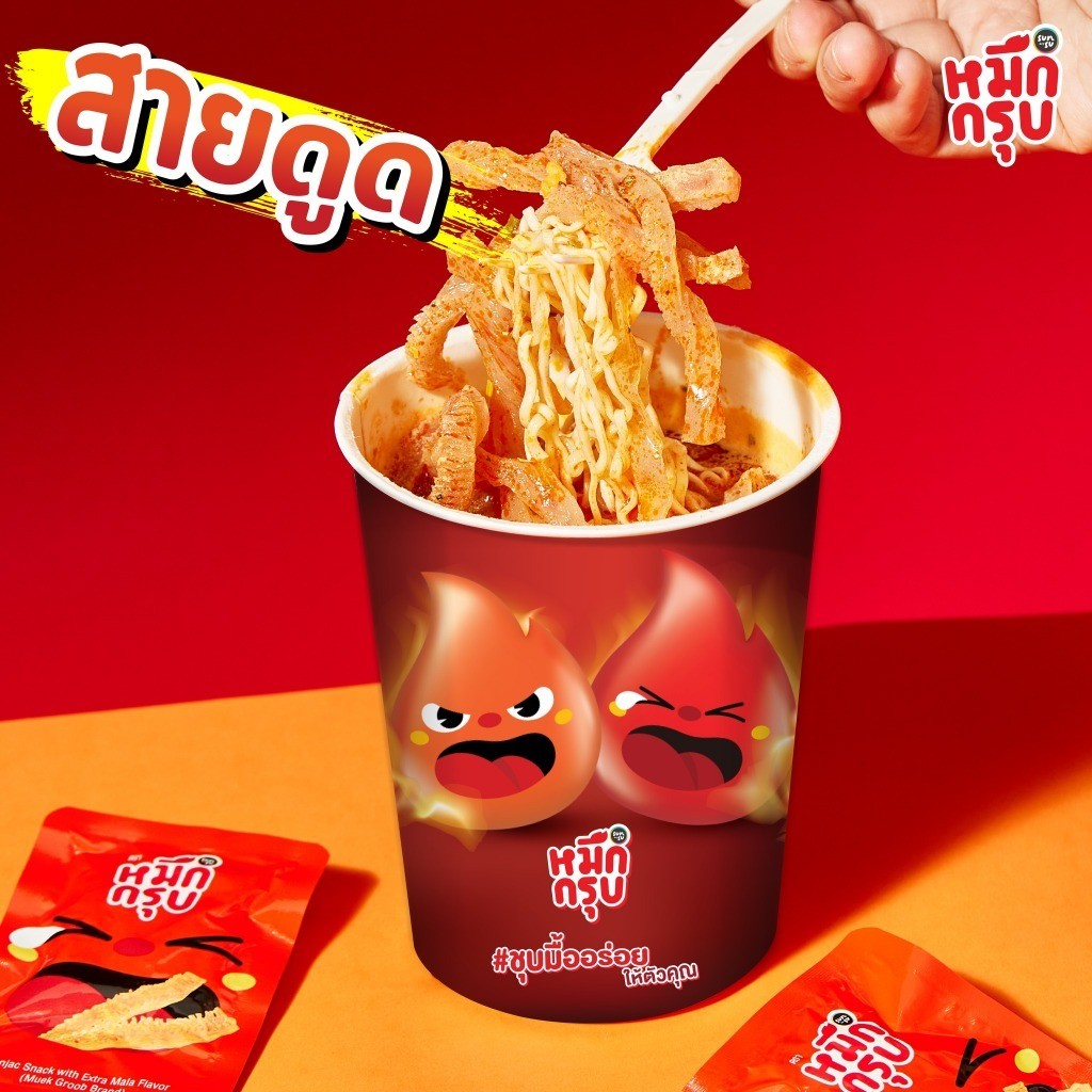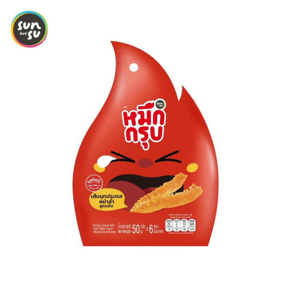(แพ็ก 12 ซอง) Muek Groob หมึกกรุบ เส้นบุกปรุงรสหม่าล่า สูตรเผ็ดไฟลุก หมึกกรุบซันซุ sunsu