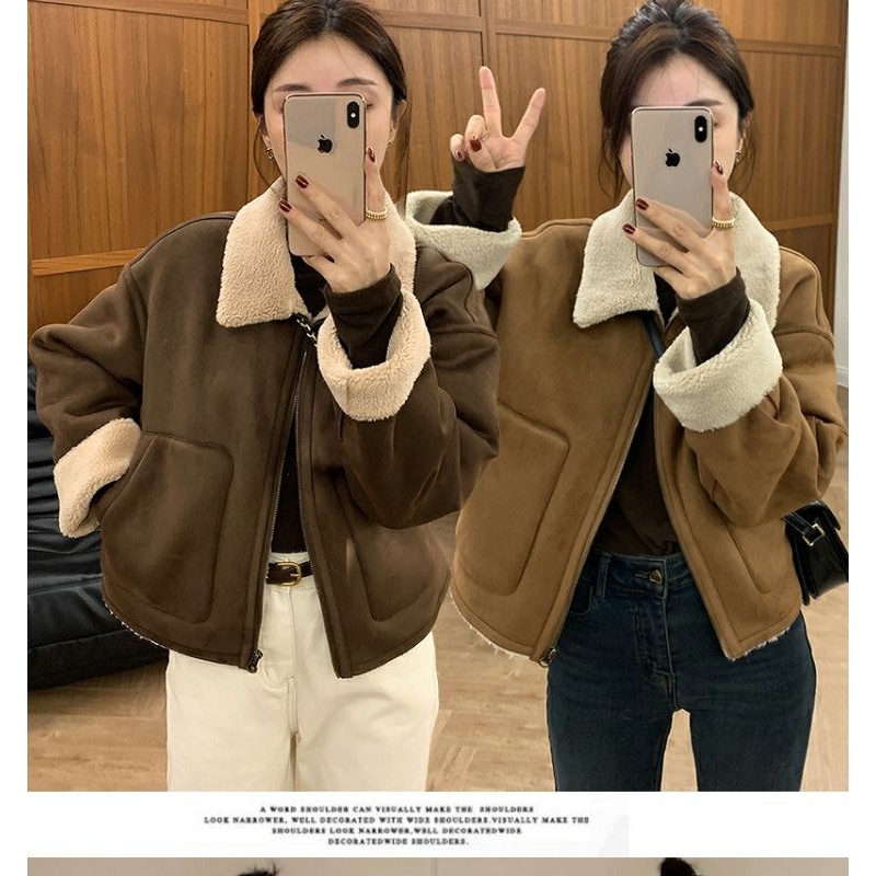 ฤดูใบไม้ร่วงฤดูหนาวผู้หญิงสไตล์เกาหลีย้อนยุคขนหนึ่งชิ้นเสื้อแกะหนาอบอุ่นปกเสื้อรถจักรยานยนต์