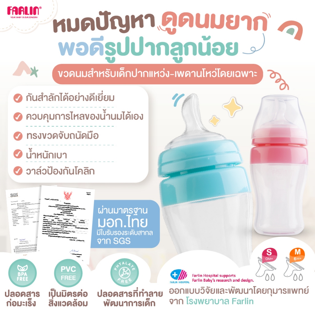(มีมอก.) ขวดนมเด็กปากแหว่ง-เพดานโหว่ Farlin ขวดนิ่มบีบได้ จุกพอดีรูปปาก กันสำลัก+กันโคลิก+ไม่รั่วซึม