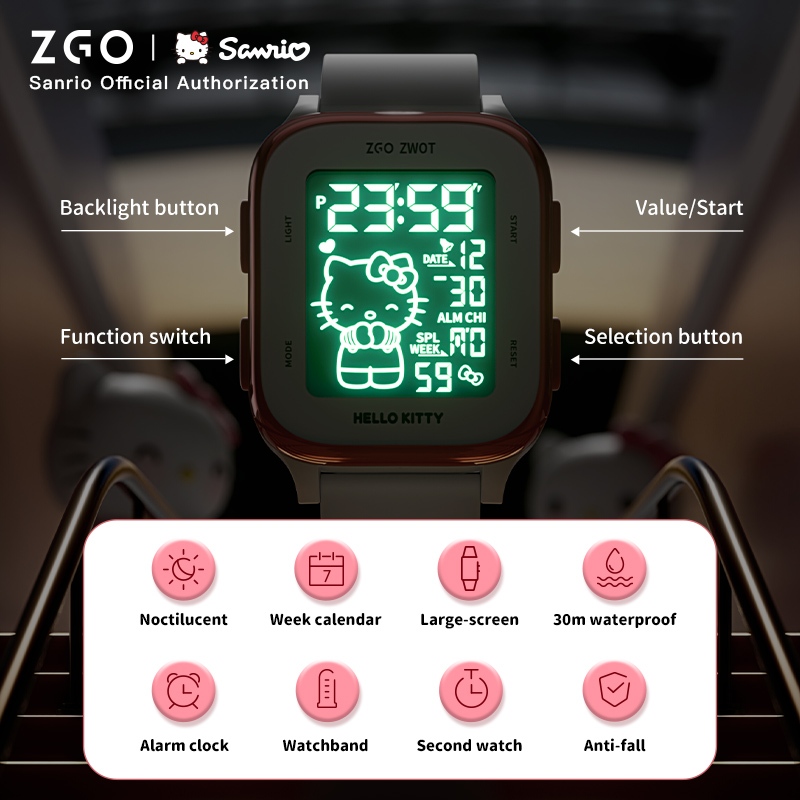 ZGO x Sanrio Hello Kitty นาฬิกาผู้หญิง กันน้ำ100% ไฟ LED สำหรับนักเรียนและเด็กผู้หญิง นาฬิกาคิตตี้ 878