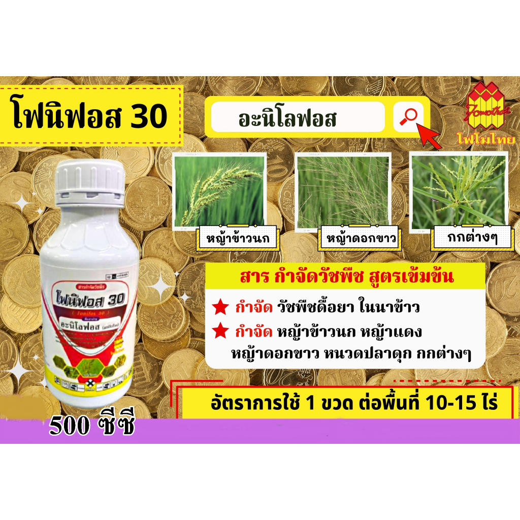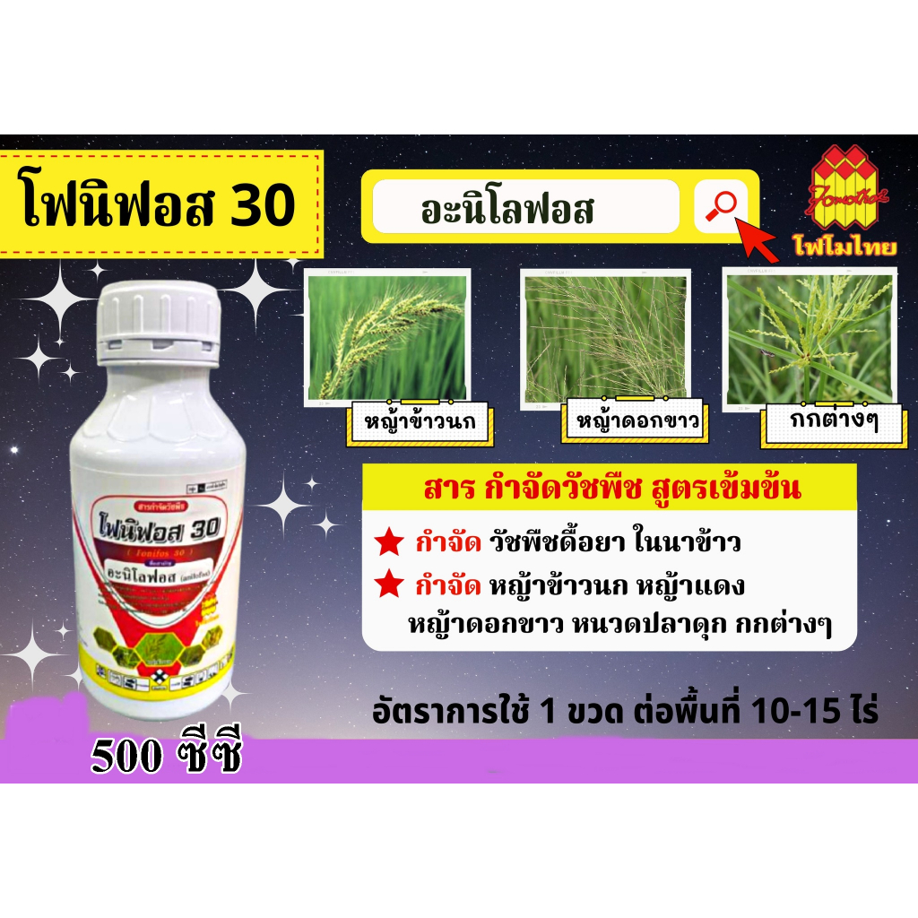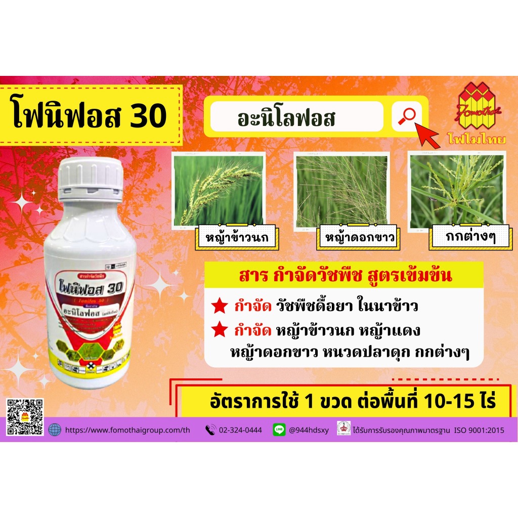 โฟนิฟอส30ขนาด 500 ซีซี อะนิลโลฟอส30%EC สูตรผสม เซฟเฟนเนอร์ กำจัดวัชพืชใบแคบในนาข้าว ข้าวนก กระดูกไก่หญ้าแดง ผสมยาคุมฆ่า