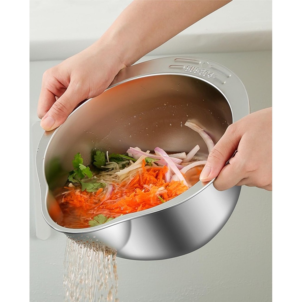 กะละมังขูดผัก หั่นผัก สแตนเลส 304 - กะละมังมีรู ตะแกรง ล้างผัก ซาวข้าว พร้อมตะขอติดผนัง