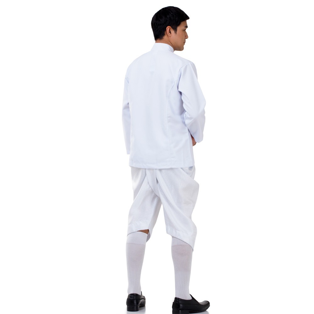 ชุดไทยราชปะแตนชายเซ็ตเสื้อราชปะแตนสีขาวผ้าโซล่อนและโจงกระเบนผ้าไหมเทียมสีขาว