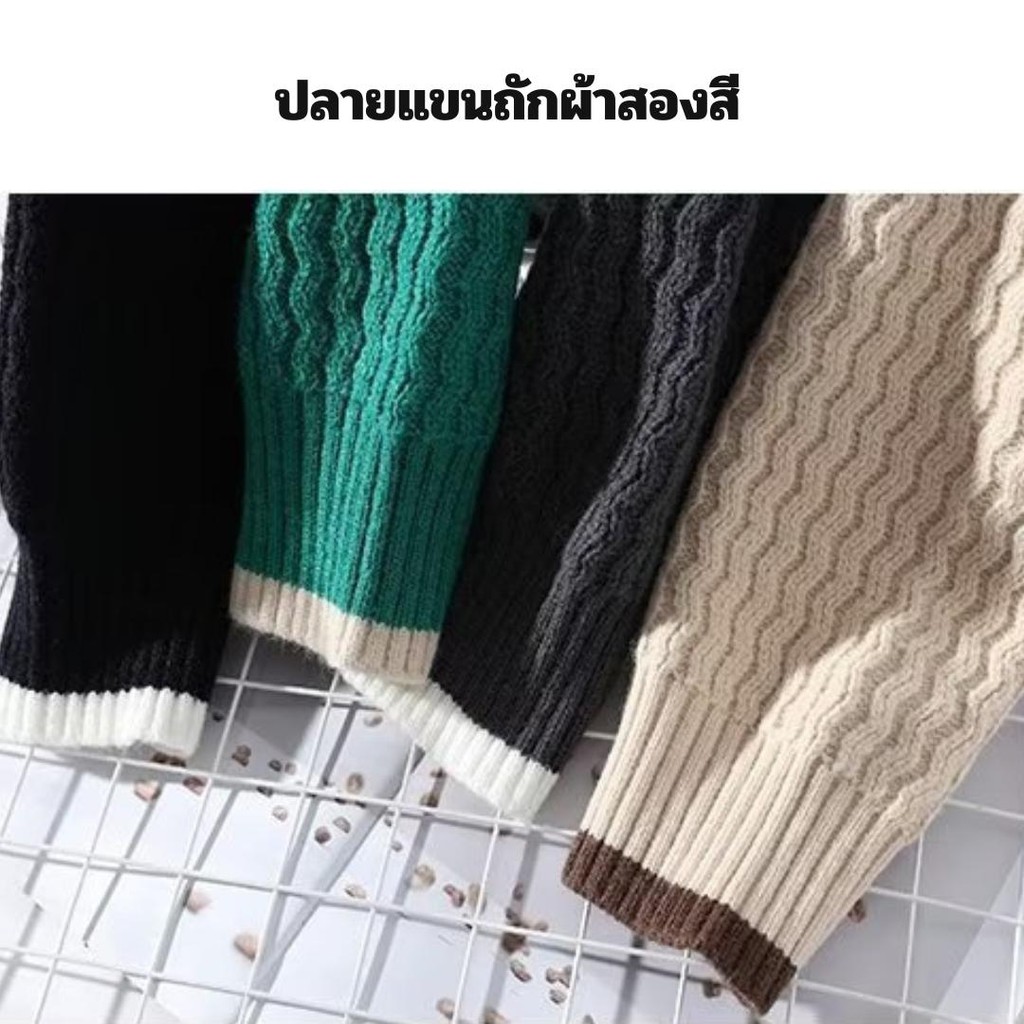 MNO.9 Sweater 761 สเวตเตอร์ไหมพรม คอถักผ้าสองสี ไหมพรมเส้นใหญ่ ผ้าหนา เสื้อแขนยาว เสื้อกันหนาว สินค้าพร้อมส่ง